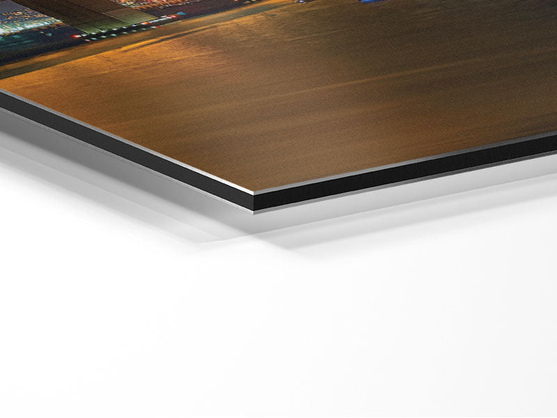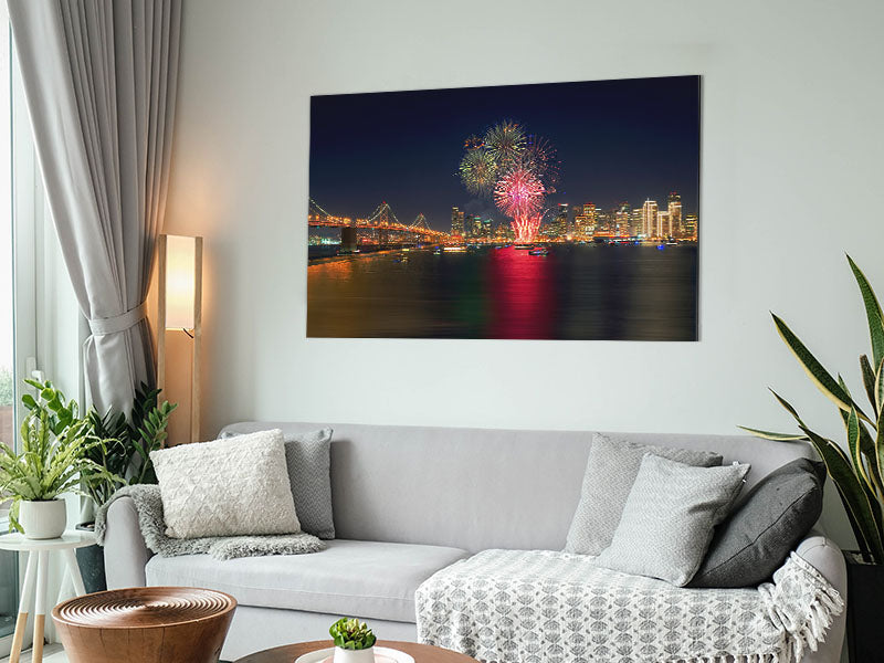 Feuerwerk über der Golden Gate Bridge. Gedruckt auf gebürstetem Aluminium-Dibond. Eine moderne Art, Kunst zu präsentieren und leicht zu pflegen.