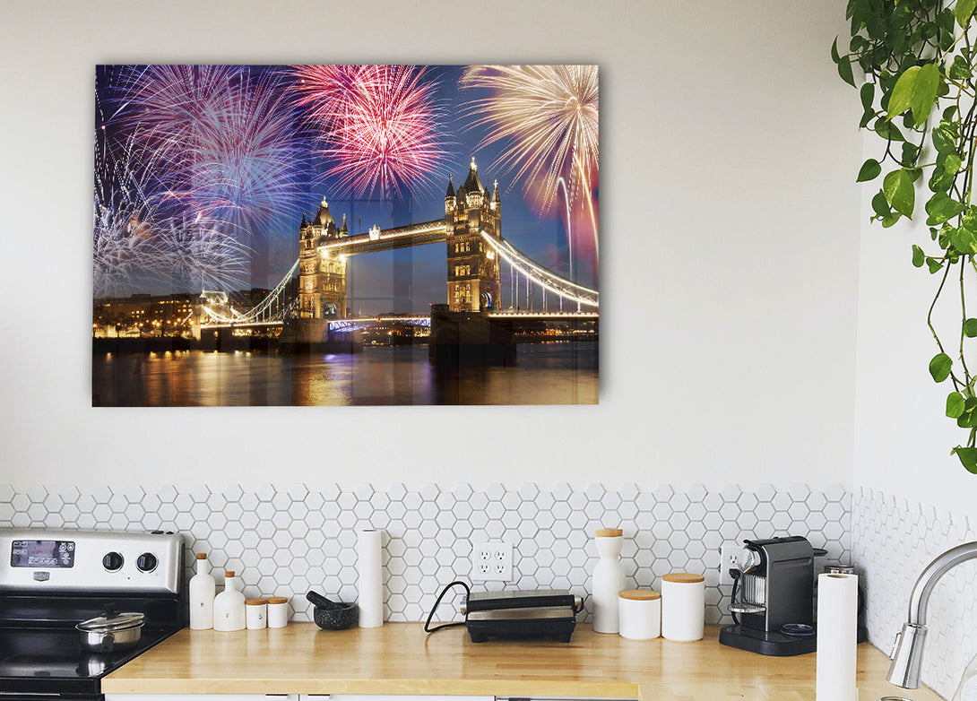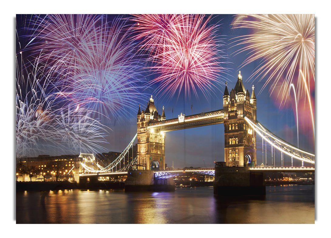 Acryldruck „Feuerwerk über der Tower Bridge“, UV-gedruckt auf 5 mm dickes Acrylglas. Wird mit allem geliefert, was Sie zum Aufhängen an die Wand brauchen.