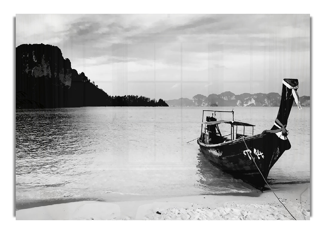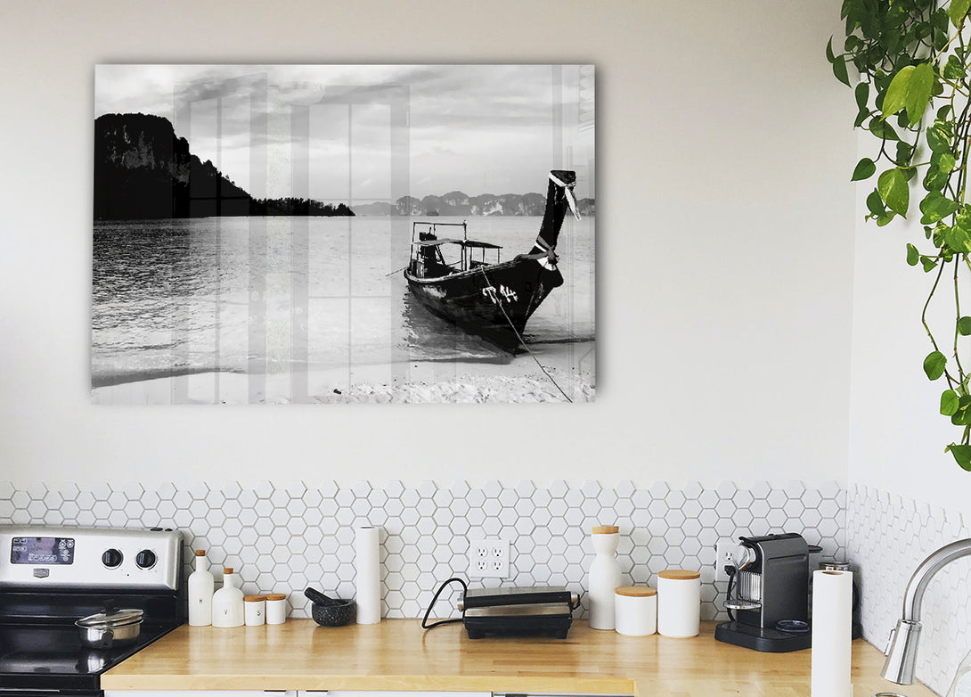 Schwarzweiß-Acryldruck „Fischerboot“, UV-gedruckt auf 5 mm dickes Acrylglas. Wird mit allem geliefert, was Sie zum Aufhängen an die Wand benötigen.
