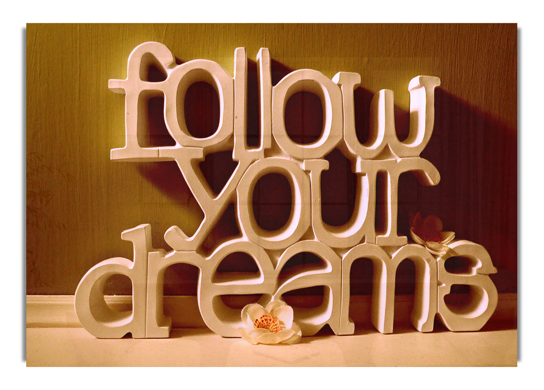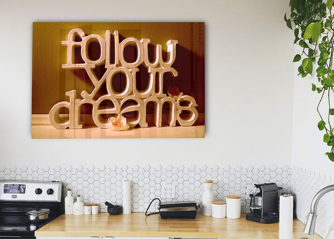Acryldruck „Follow Your Dreams“, UV-gedruckt auf 5 mm dickes Acrylglas. Wird mit allem geliefert, was Sie zum Aufhängen an die Wand brauchen.