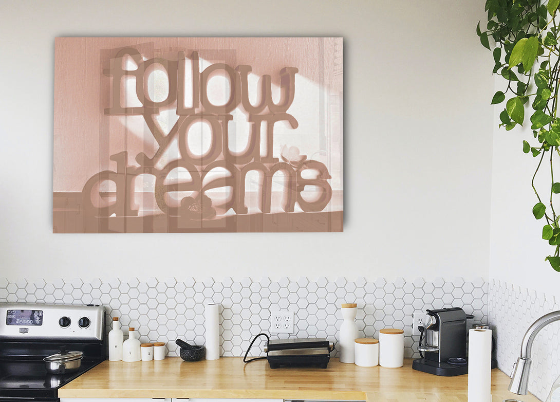 Follow Your Dreams Beiger Acryldruck, UV-gedruckt auf 5 mm dickes Acrylglas. Wird mit allem geliefert, was Sie zum Aufhängen an die Wand brauchen.