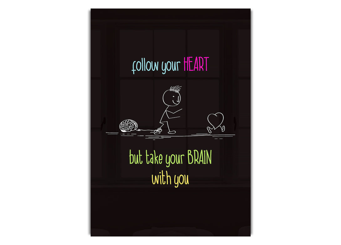 Acryldruck „Follow Your Heart But Take Your Brain“, UV-gedruckt auf 5 mm dickem Acrylglas. Wird mit allem geliefert, was Sie zum Aufhängen an die Wand brauchen.
