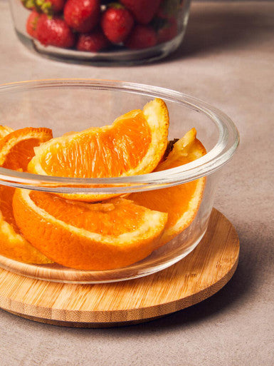 This 620ml round glass container is oven safe and the glass makes it easy to identify the contents. A tightly fitted bamboo lid is airtight, making it ideal for food storage.
