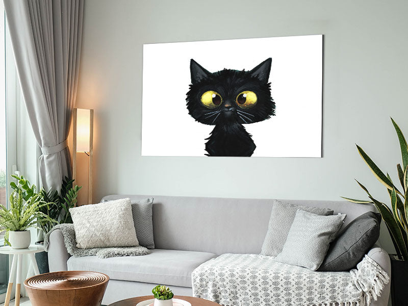 Lustige schwarze Katze, gedruckt auf gebürstetem Aluminium-Dibond. Eine moderne Art, Kunst zu präsentieren und leicht zu pflegen.