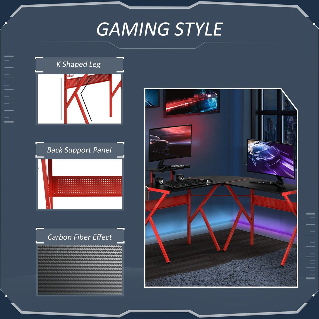 Attention to detail wins games, and trust that this L shaped gaming desk is built to win. Our HOMCOM gaming table features a large desktop to place your electronic devices or other necessities, keeping you engaged in the game. This home office desk features built-in support for all your gaming hardware, providing solutions for your headphones, monitors and drinks. L-shaped design make it suit for corner use. This gamer desk can seamlessly take you from a work station to a battle station.