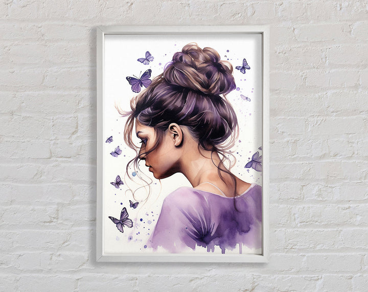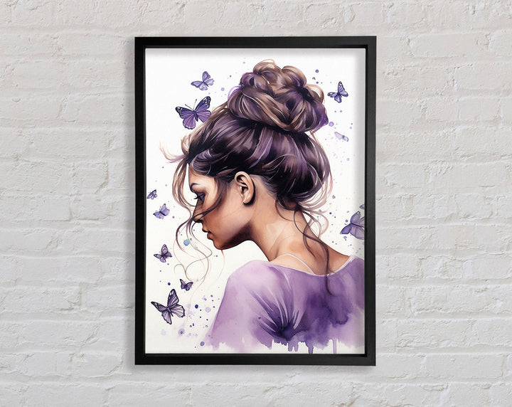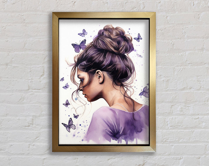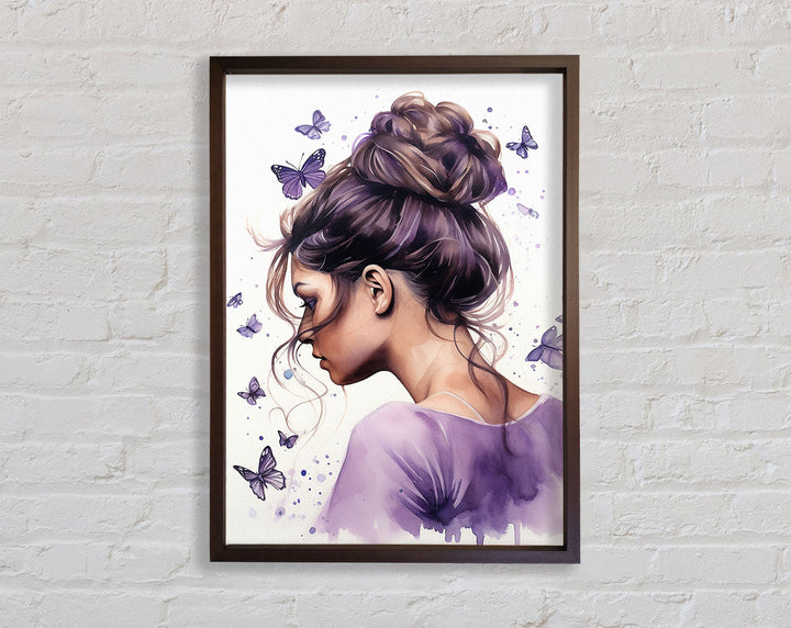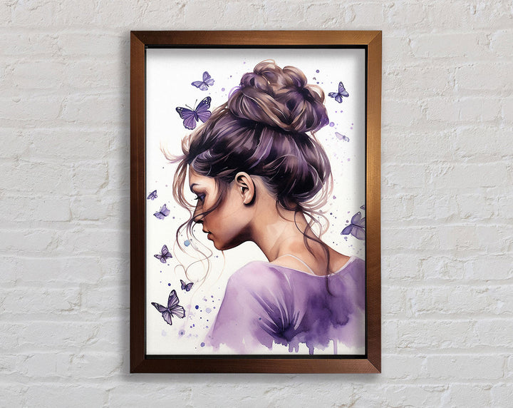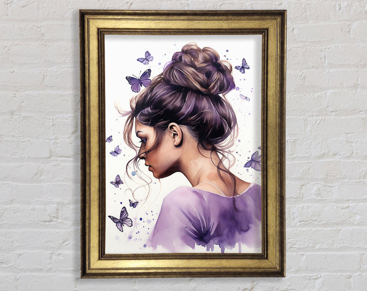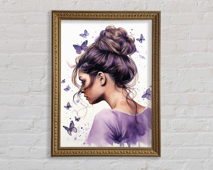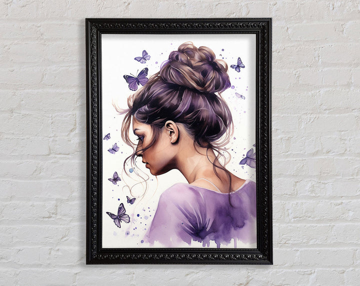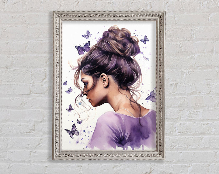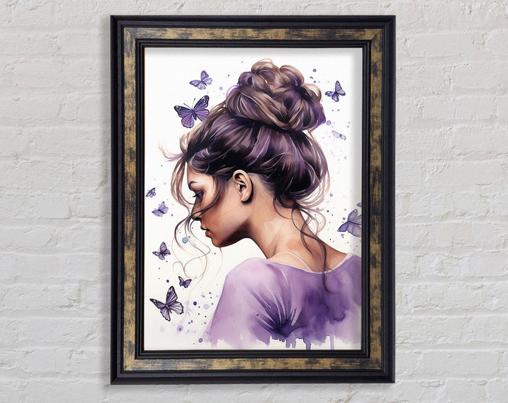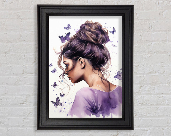 Girl With Bun Lilac Butterflies Framed Print