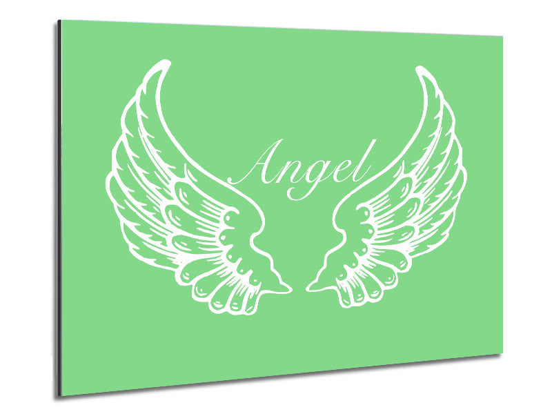 Mädchenzimmer-Zitat „Engelsflügel“ in Grün, gedruckt auf gebürstetem Aluminium-Dibond. Eine moderne Art, Kunst zu präsentieren und leicht zu pflegen.