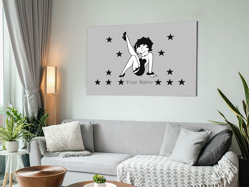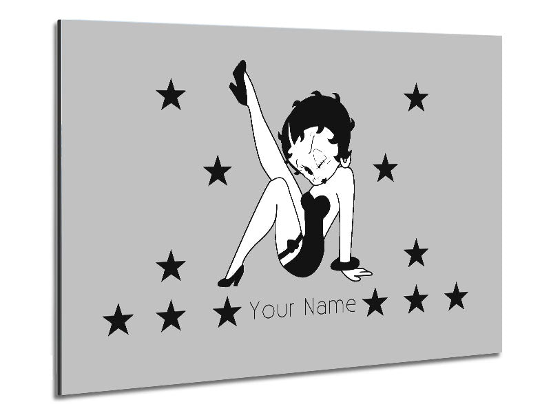 Zitat für Mädchenzimmer: Betty Boop, Dein Name, Sterne, Grau. Gedruckt auf gebürstetem Aluminium-Dibond. Eine moderne Art, Kunst zu präsentieren und leicht zu pflegen.