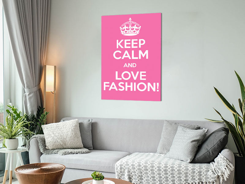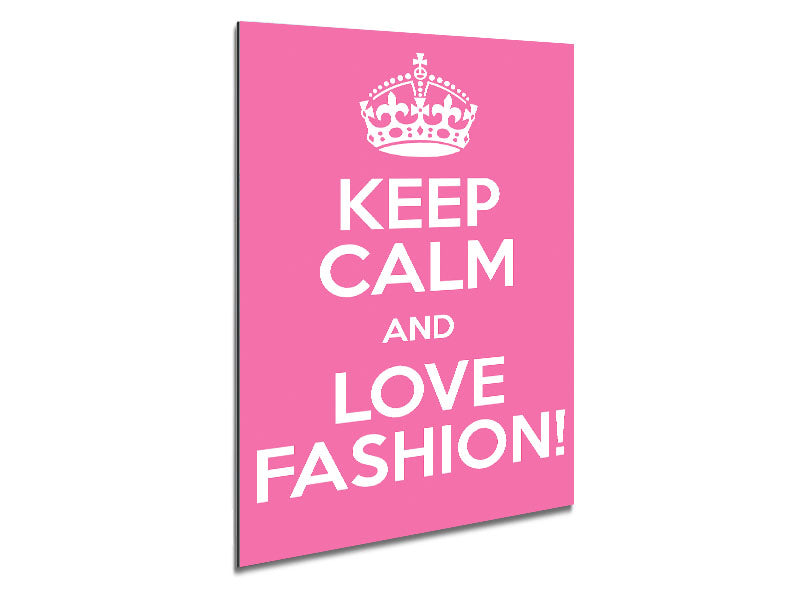 Zitat „Keep Calm Fashion“ für Mädchenzimmer. Gedruckt auf gebürstetem Aluminium-Dibond. Eine moderne Art, Kunst zu präsentieren und leicht zu pflegen.