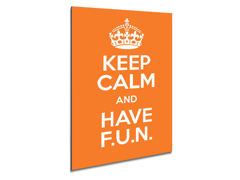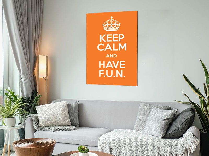 Zitat „Keep Calm Fun“ für Mädchenzimmer, orange, gedruckt auf gebürstetem Aluminium-Dibond. Eine moderne Art, Kunst zu präsentieren und leicht zu pflegen.