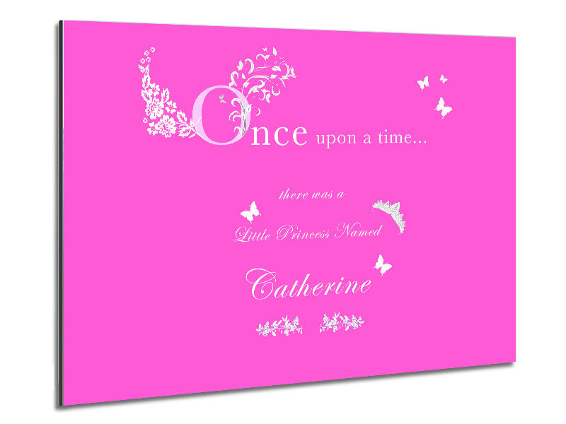 Zitat für Mädchenzimmer „Once Upon A Time Your Name“ in leuchtendem Pink. Gedruckt auf gebürstetem Aluminium-Dibond. Eine moderne Art, Kunst zu präsentieren und leicht zu pflegen.