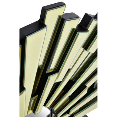 This large glitzy wall mirror boasts a sunburst design that complements the aesthetics of a living room. The tapered glass is carefully arranged on the circular frame exuding the warm metallic effect.