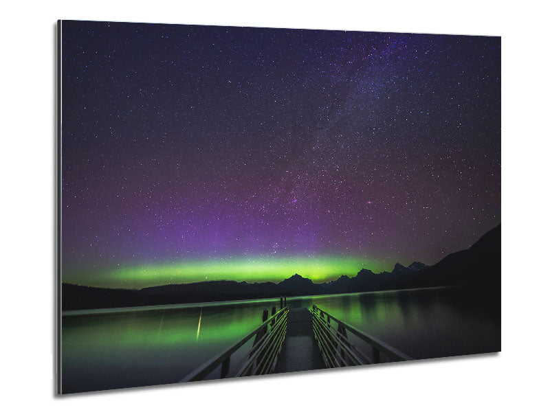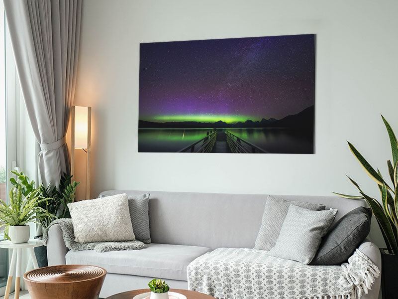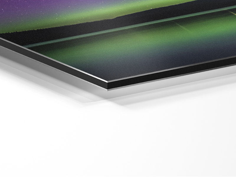 Schein der Nordlichter. Gedruckt auf gebürstetem Aluminium-Dibond. Eine moderne Art, Kunst zu präsentieren und leicht zu pflegen.