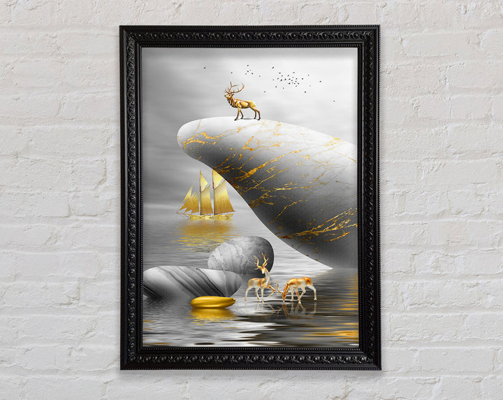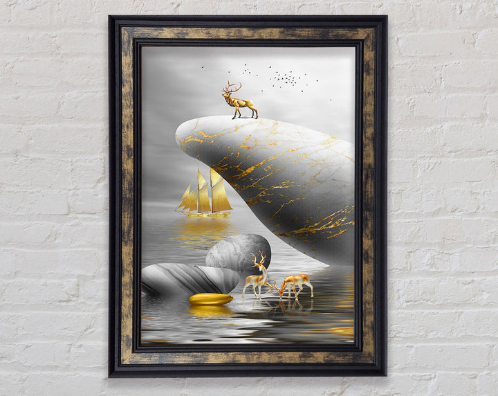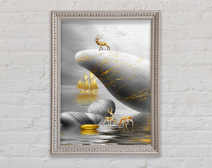 Gold Boat Deers On Roack Framed Print