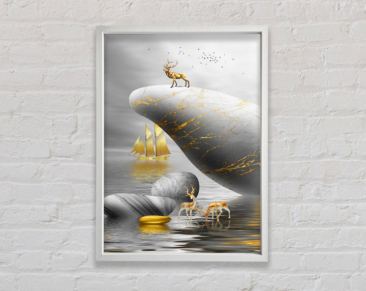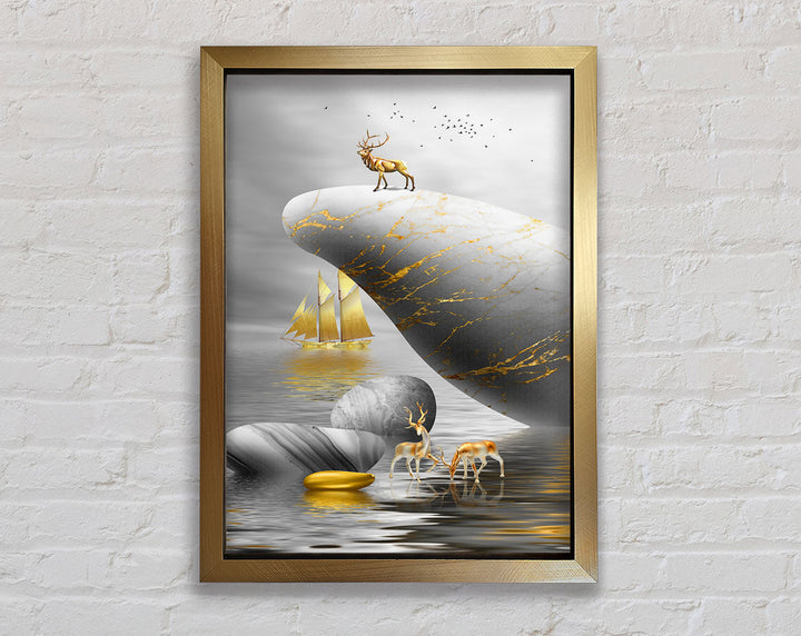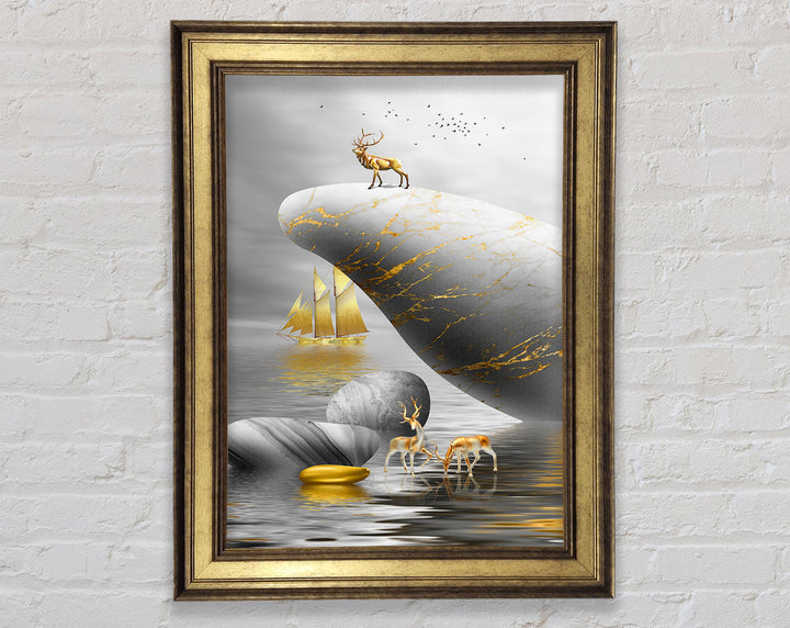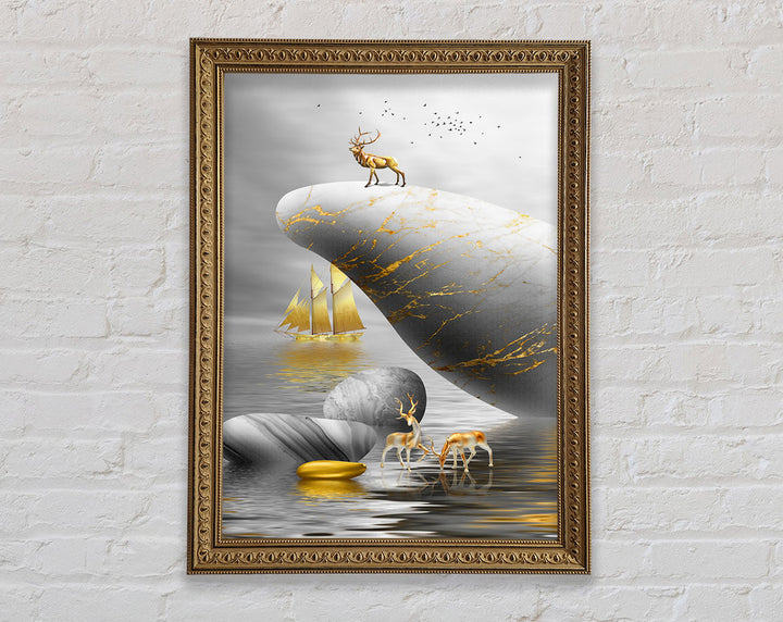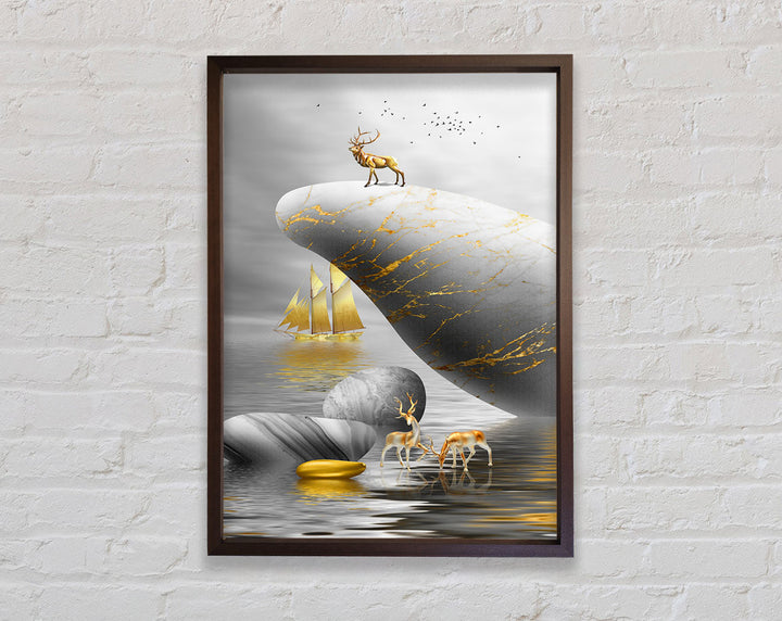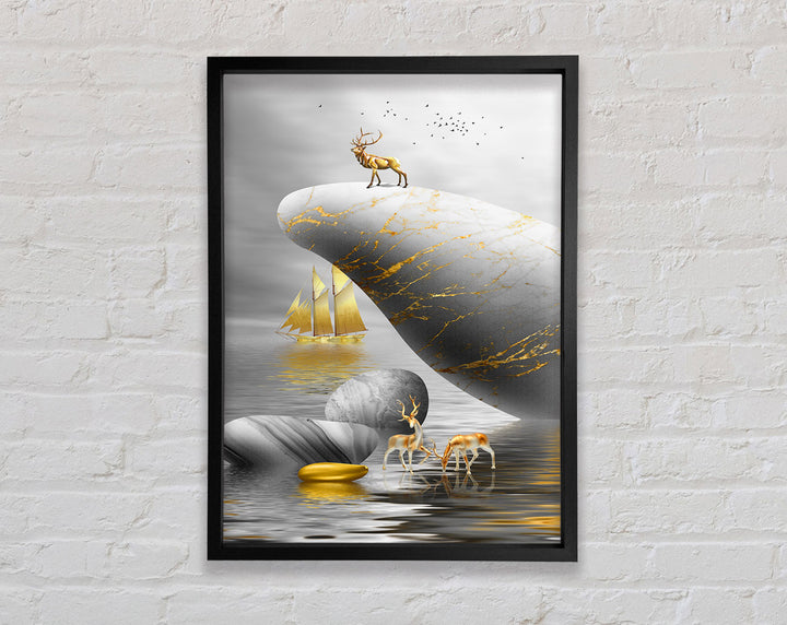 Introducing the Gold Boat Deers On Rock Framed Print, a stunning piece of framed art that brings elegance and nature into your home. This beautiful artwork features majestic deer standing on a rock with a serene gold boat in the background, creating a tranquil scene perfect for any room. Available in six sizes, ranging from small to oversized, this framed print fits any space and style. Choose from a variety of colors to match your decor. Each piece is meticulously handmade in the United Kingdom, ensuring high quality and attention to detail. Ready to hang right out of the box, this framed art is a convenient and stylish addition to your home. Enhance your living space with the timeless beauty of the Gold Boat Deers On Rock Framed Print.