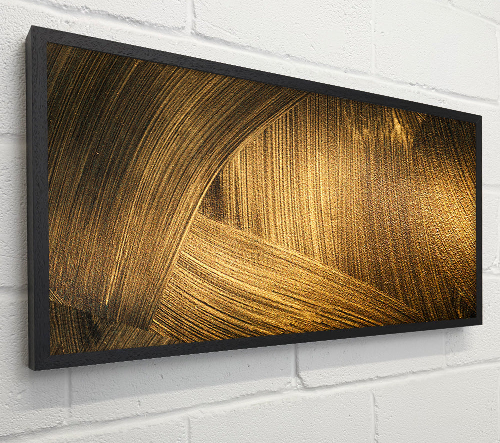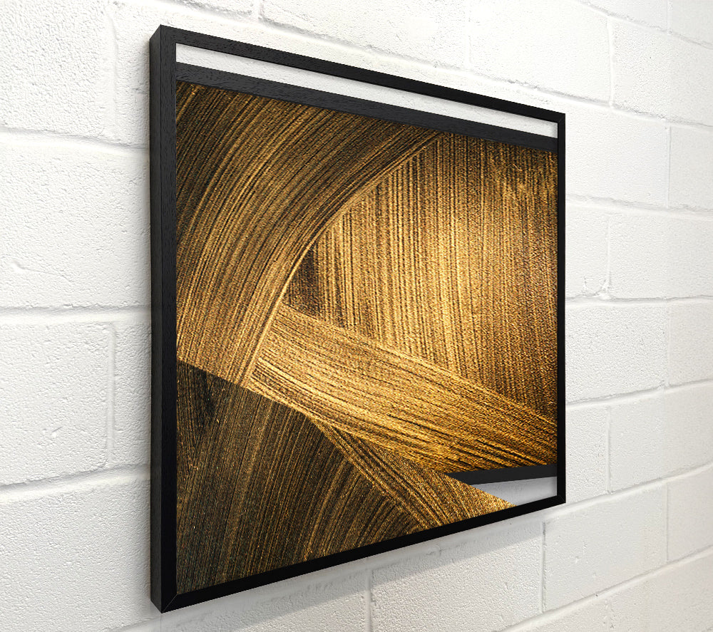 Quadratische Leinwand mit goldenen kräftigen Strichen, gedruckt auf beschichteter Polyester-Leinwand. Auf einem 44 mm großen Kastenrahmen montiert, fertig zum Aufhängen.