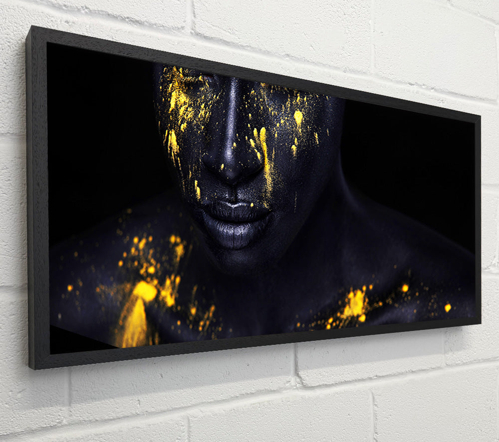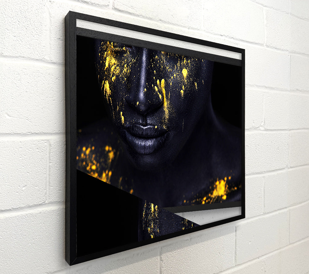 Quadratische Leinwand „Gold Glitter Woman“, gedruckt auf beschichteter Polyester-Leinwand. Auf einem 44 mm großen Kastenrahmen montiert, fertig zum Aufhängen.