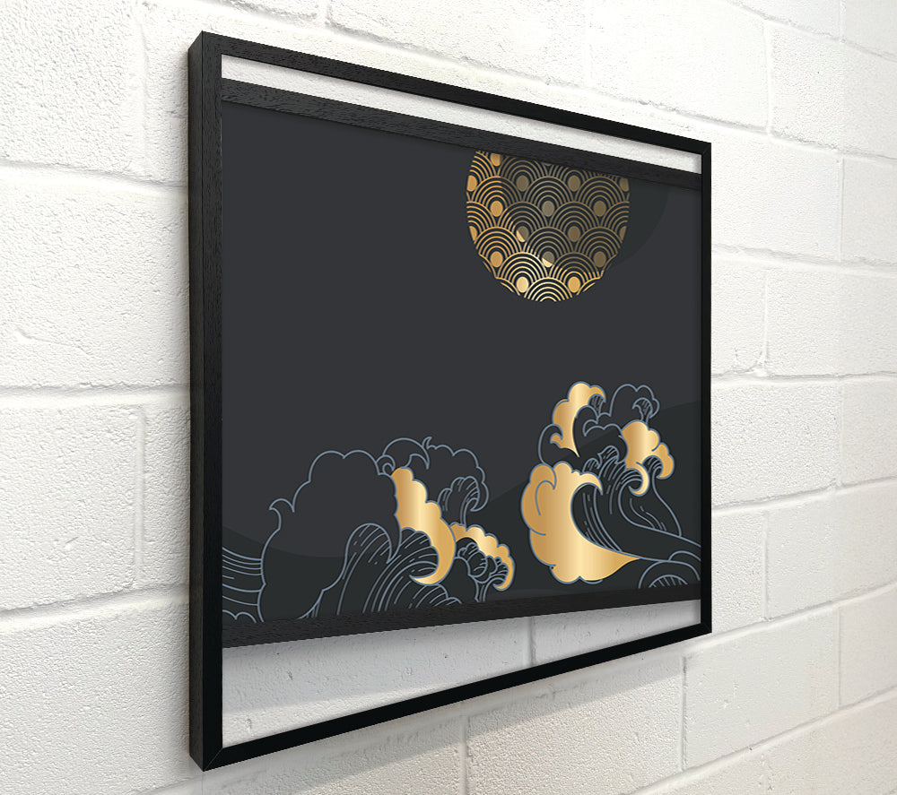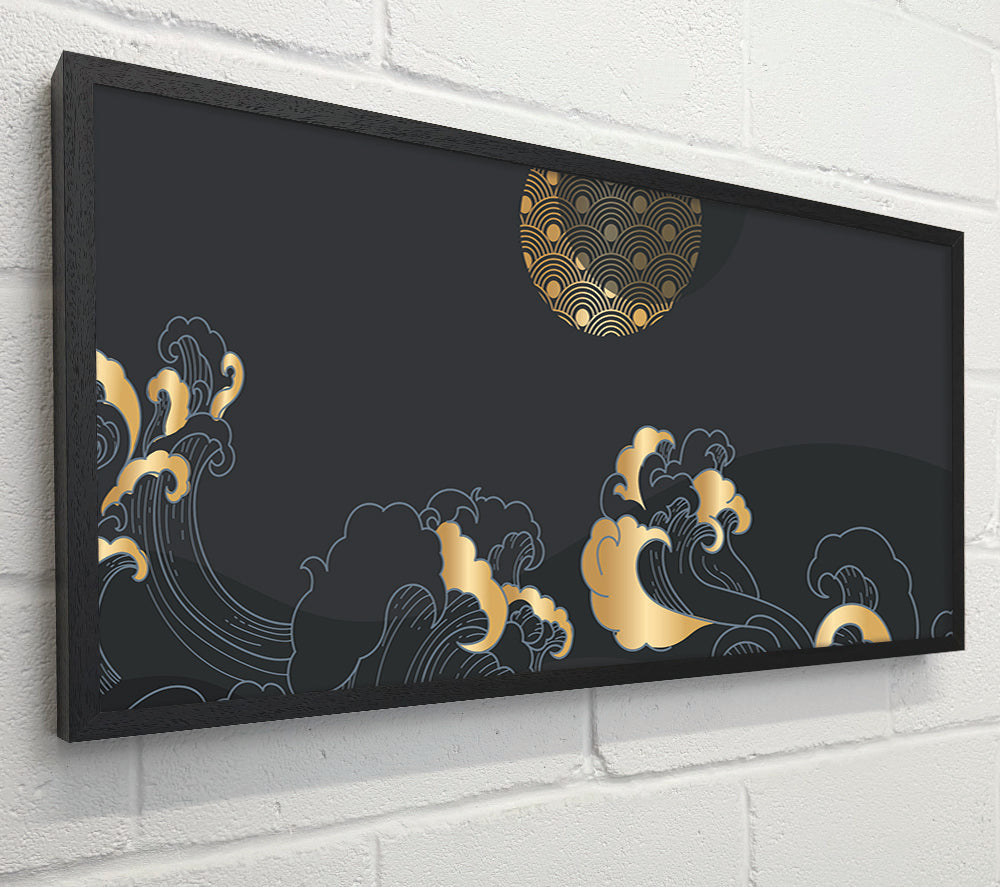 Quadratische Leinwand „Gold Waves And Sun“, gedruckt auf beschichteter Polyester-Leinwand. Auf einem 44 mm großen Kastenrahmen montiert, fertig zum Aufhängen.