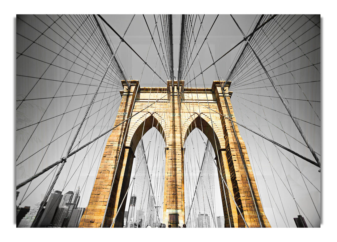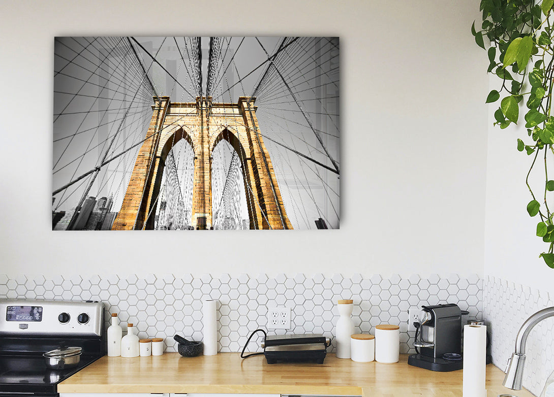 Goldener Brooklyn Bridge-Acryldruck, UV-gedruckt auf 5 mm dickes Acrylglas. Wird mit allem geliefert, was Sie zum Aufhängen an Ihrer Wand benötigen.