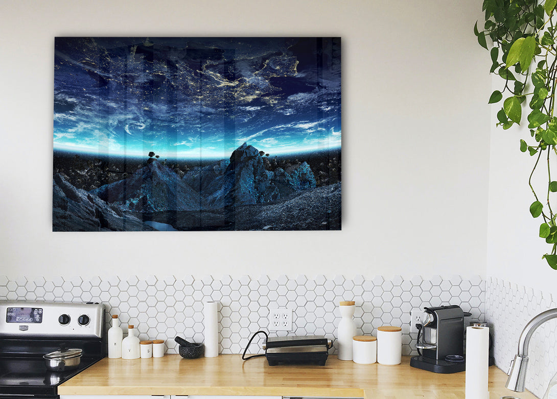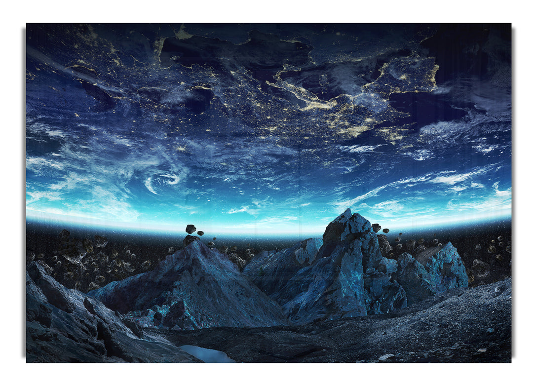 Acryldruck „Gravitationszug der Erde“, UV-gedruckt auf 5 mm dickes Acrylglas. Wird mit allem geliefert, was Sie zum Aufhängen an die Wand brauchen.
