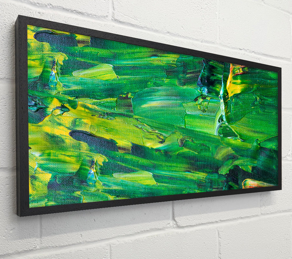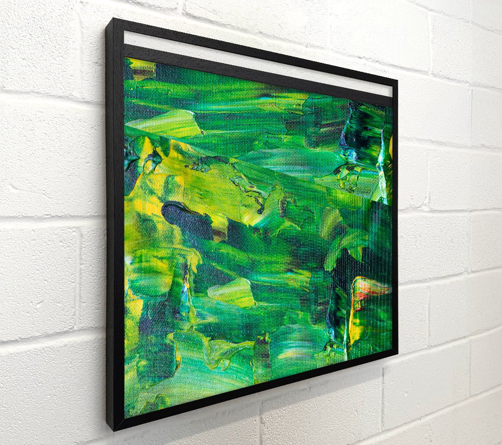 Quadratische Leinwand mit grüner und gelber Farbe, gedruckt auf beschichteter Polyester-Leinwand. Auf einem 44 mm großen Kastenrahmen montiert, fertig zum Aufhängen.
