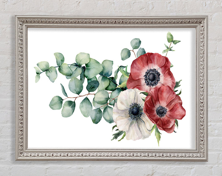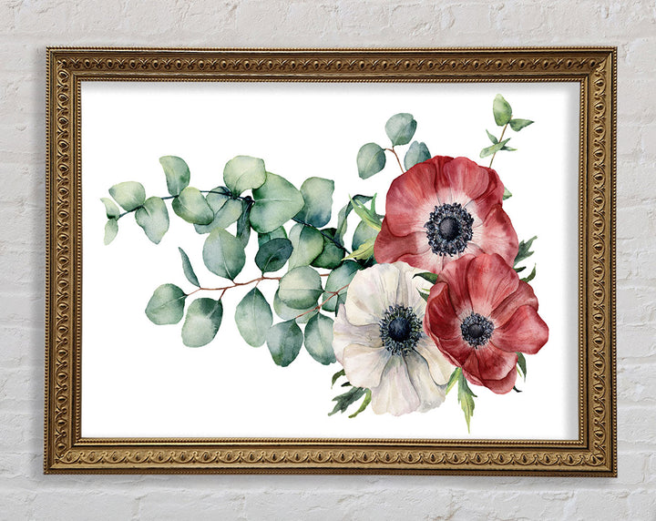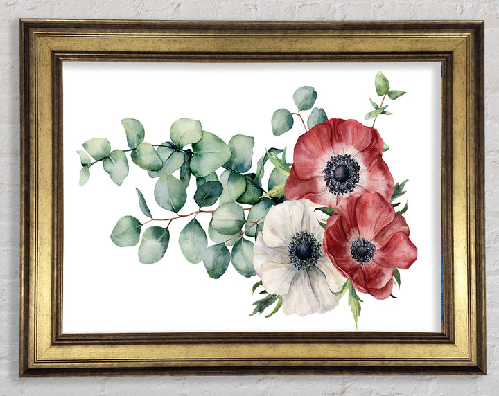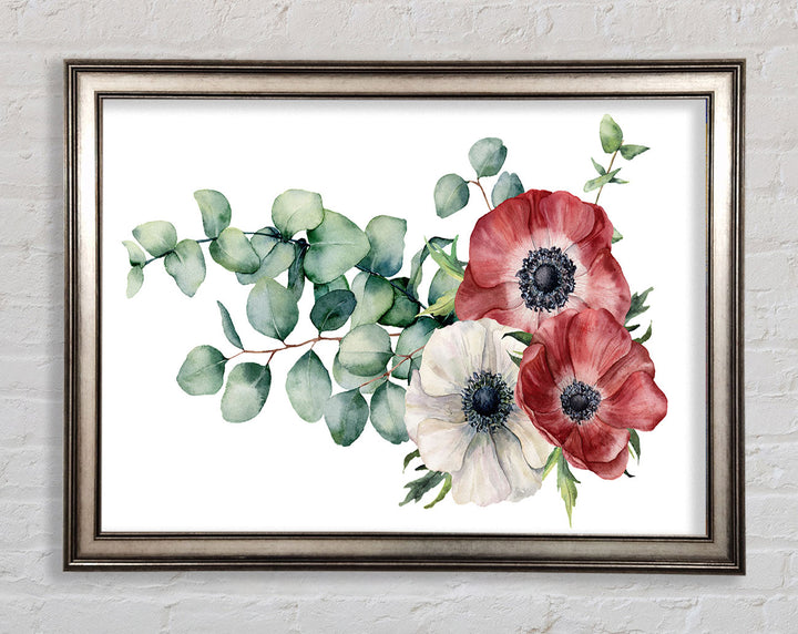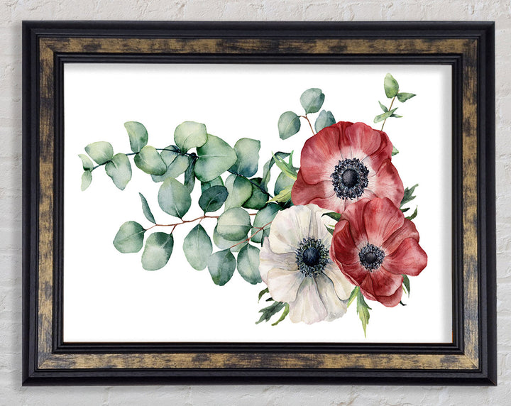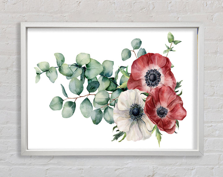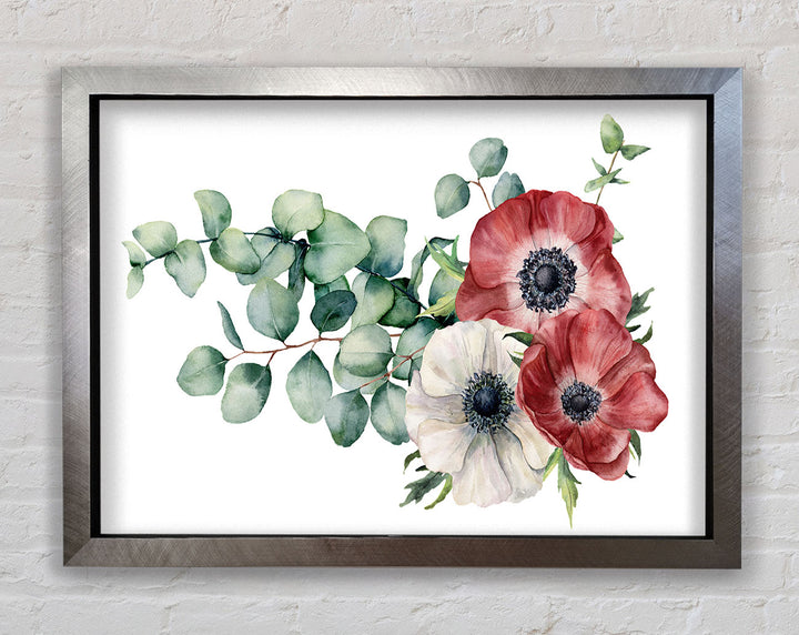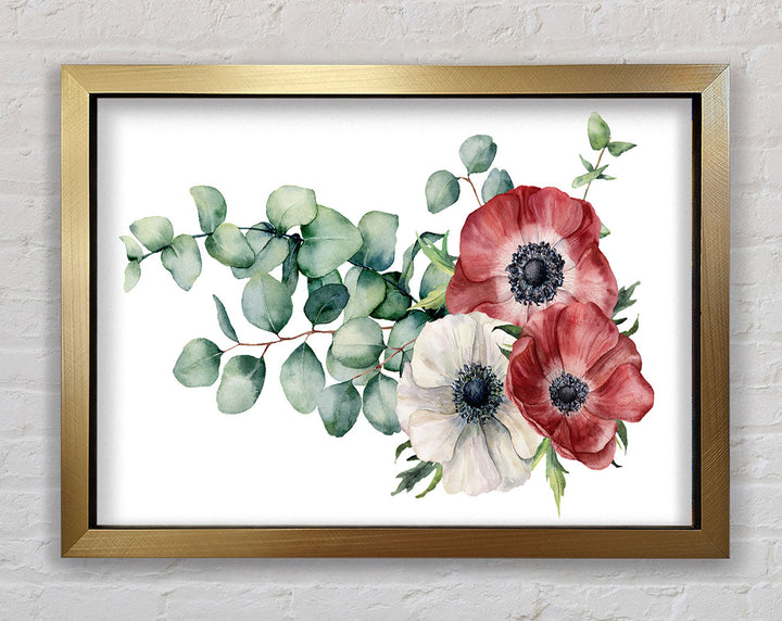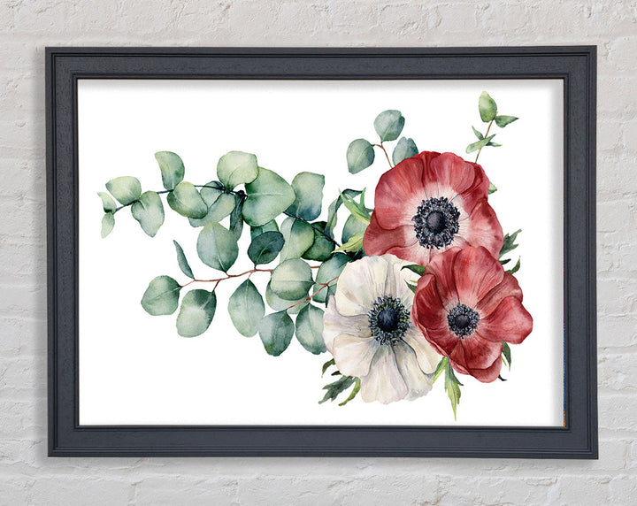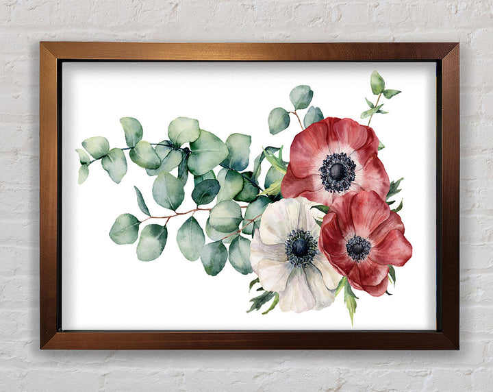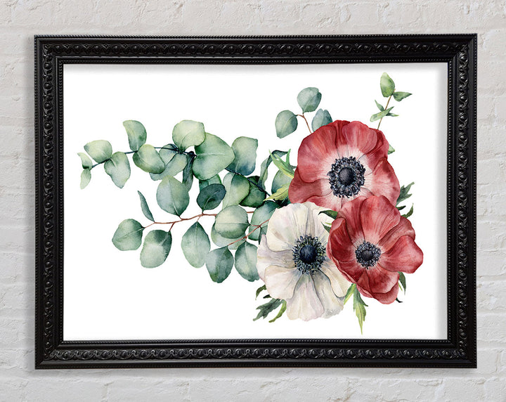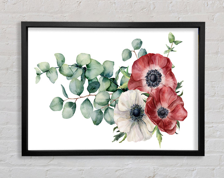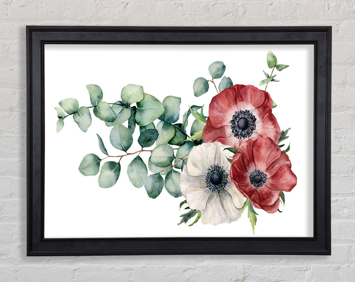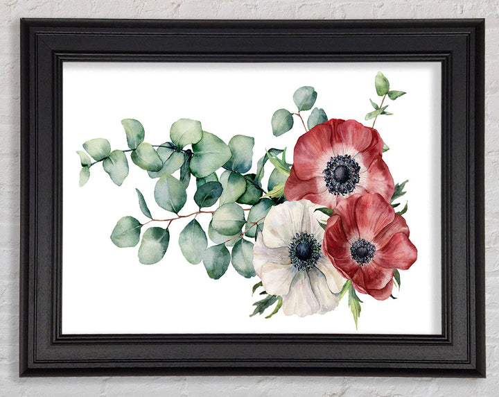 Gerahmter Druck „Grünblättriges Blumentrio“, erhältlich in mehreren Rahmenfarben. Fertig zum Aufhängen aus der Schachtel und handgefertigt im Vereinigten Königreich.