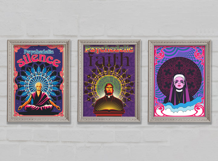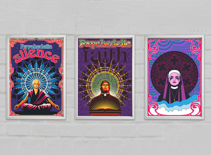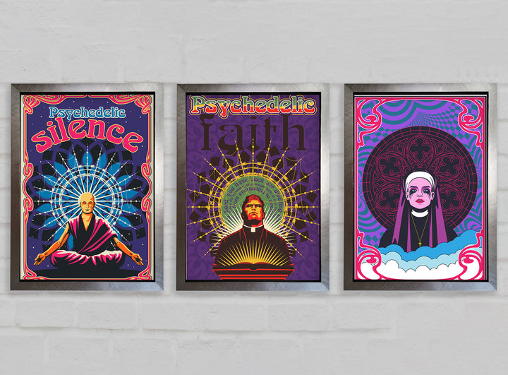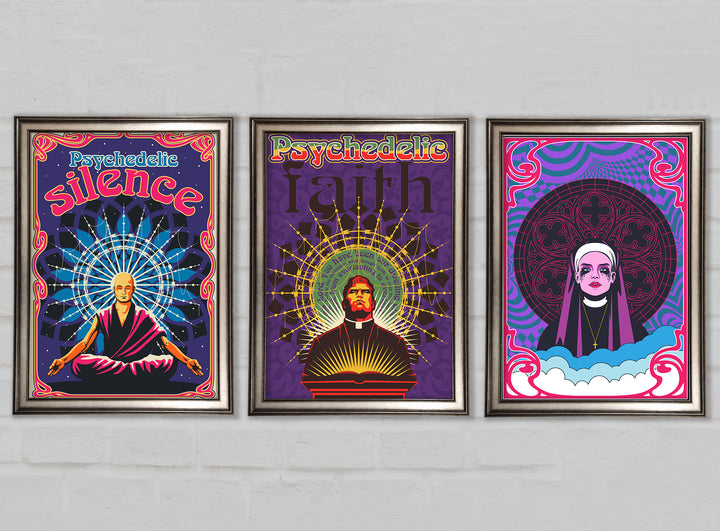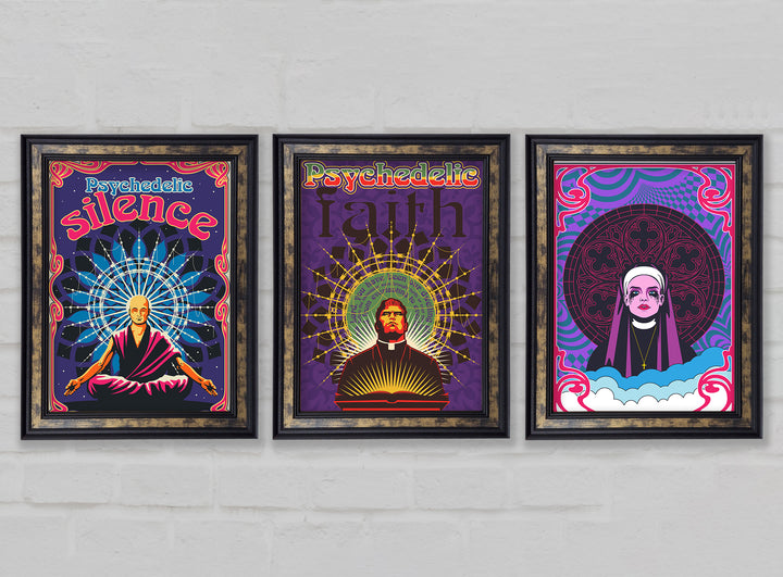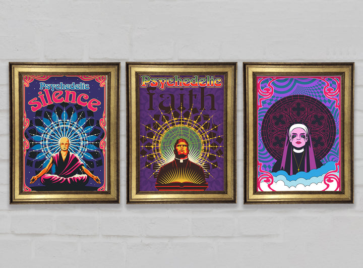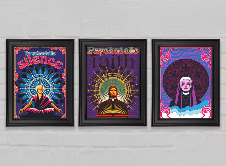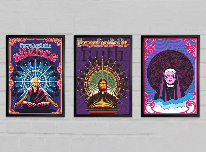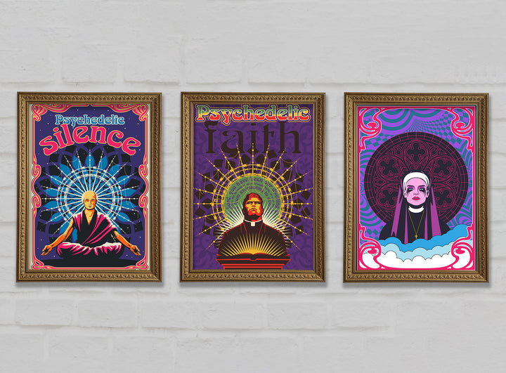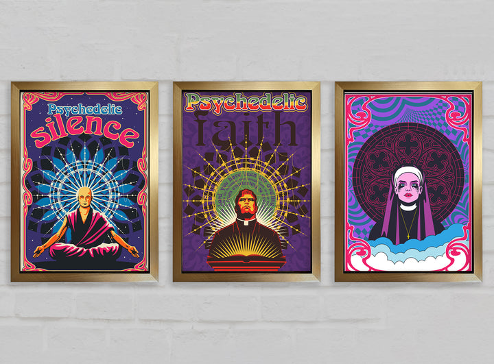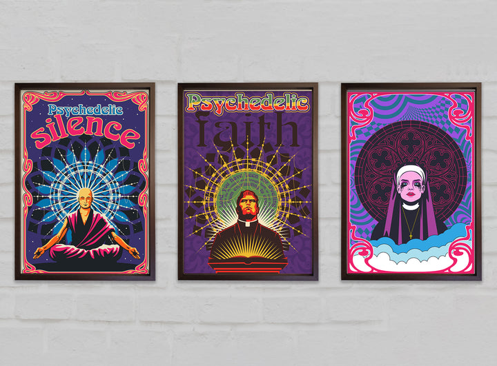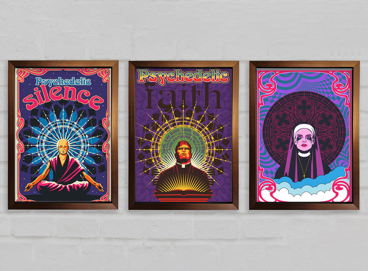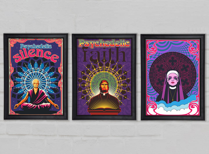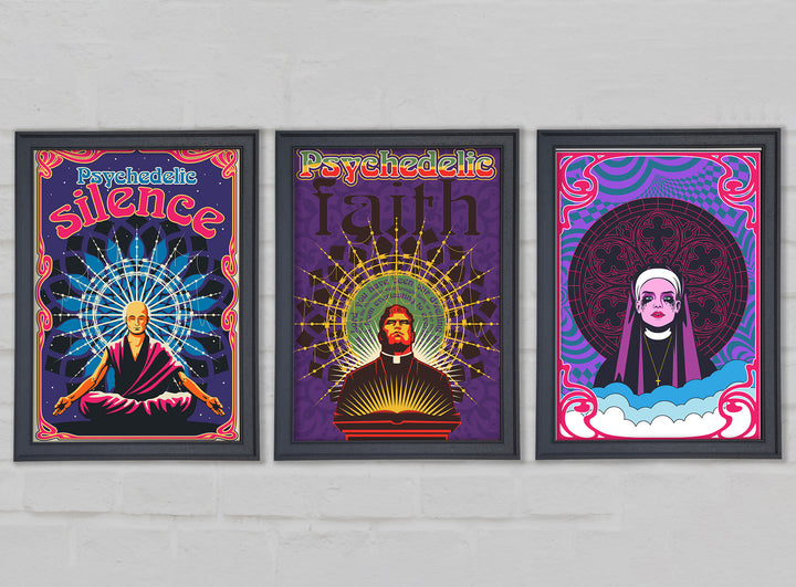 Groovy Seventies-Set mit 3 gerahmten Wandkunstdrucken, erhältlich in mehreren Rahmenfarben. Fertig zum Aufhängen aus der Schachtel und handgefertigt im Vereinigten Königreich.