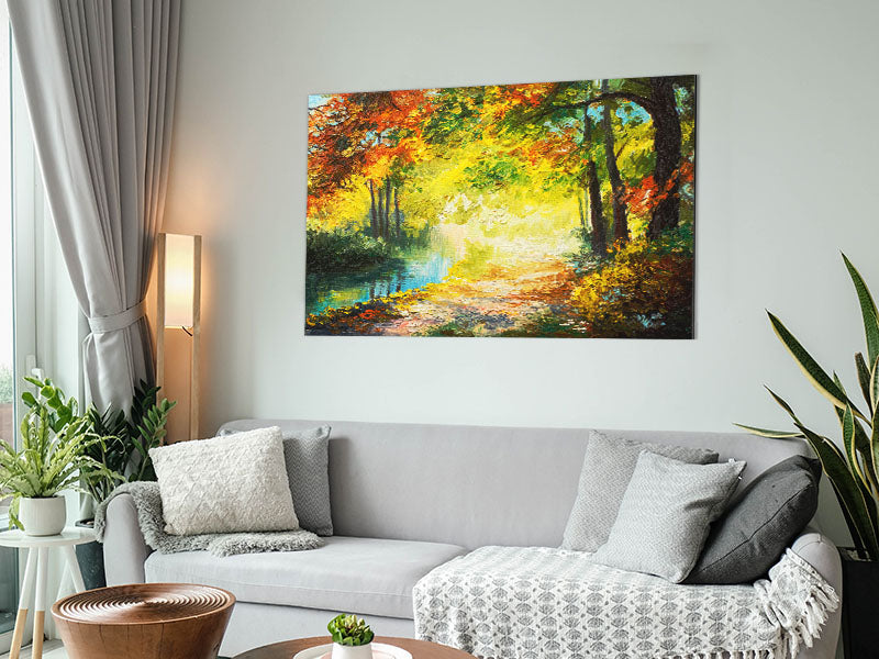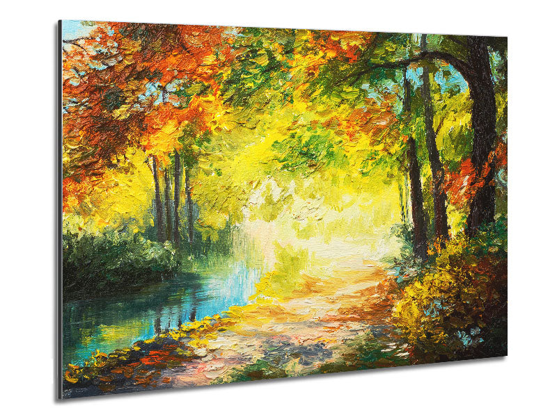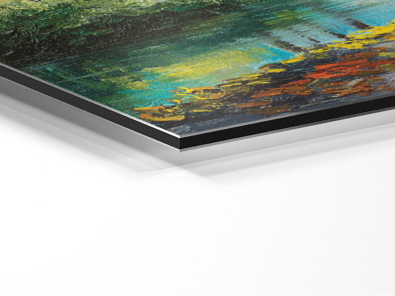Handgemalte Waldszene, gedruckt auf gebürstetem Aluminium-Dibond. Eine moderne Art, Kunst zu präsentieren und leicht zu pflegen.