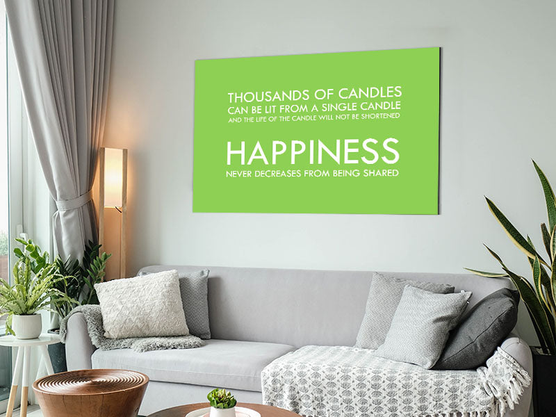 Das Glück wird nie geringer, wenn man es teilt. Limettengrün. Gedruckt auf gebürstetem Aluminium-Dibond. Eine moderne Art, Kunst zu präsentieren und leicht zu pflegen.