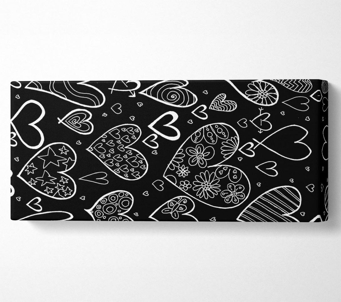 Weiße Herzen auf schwarzer Leinwand, gedruckt auf beschichteter Polyester-Leinwand. Auf einem 44 mm großen Kastenrahmen montiert, fertig zum Aufhängen.