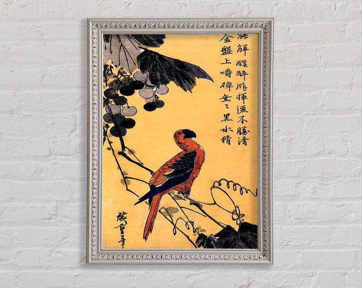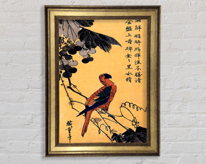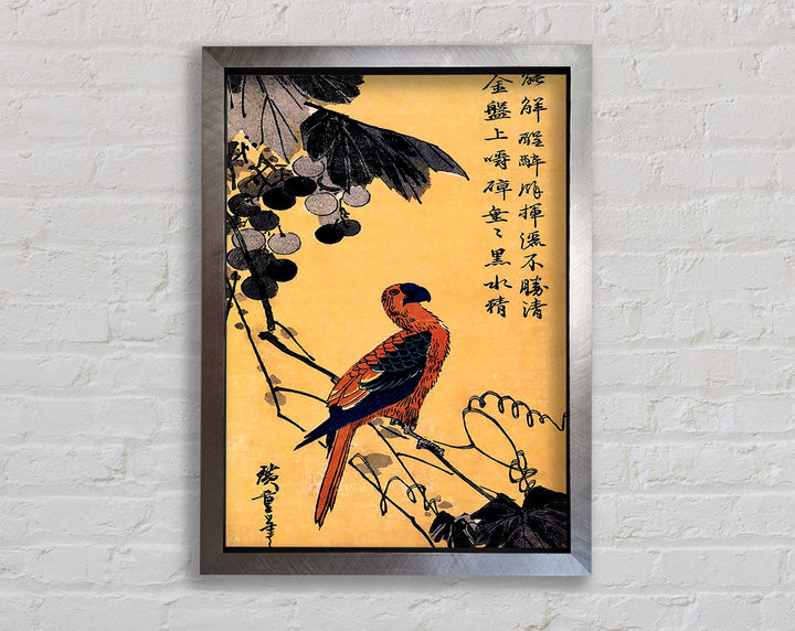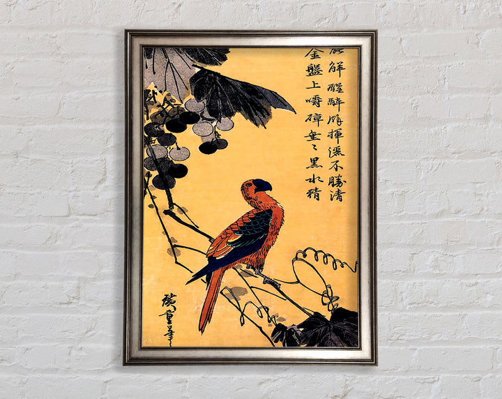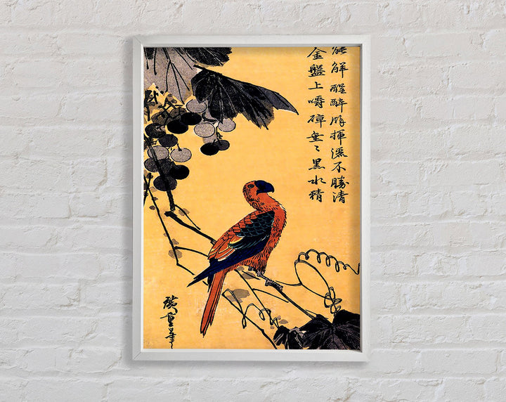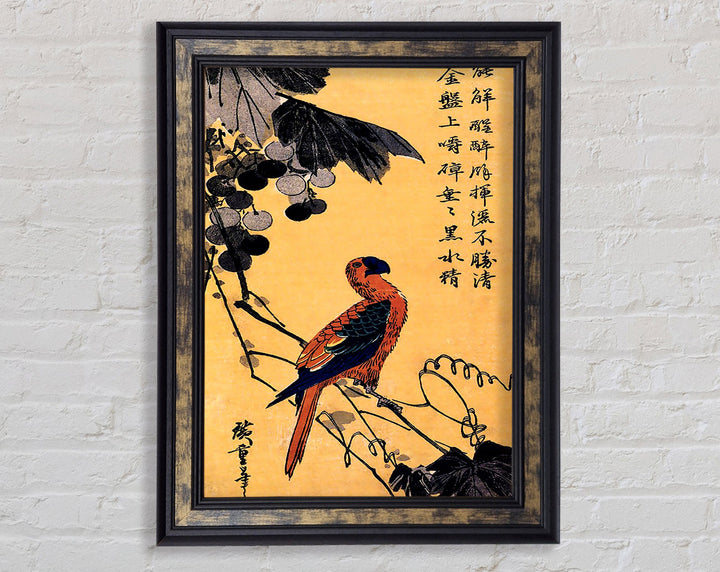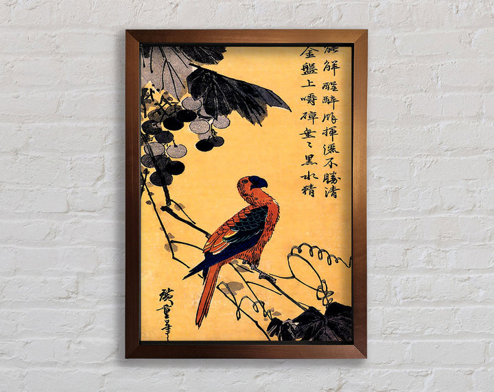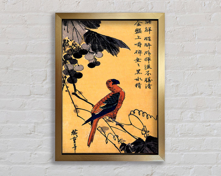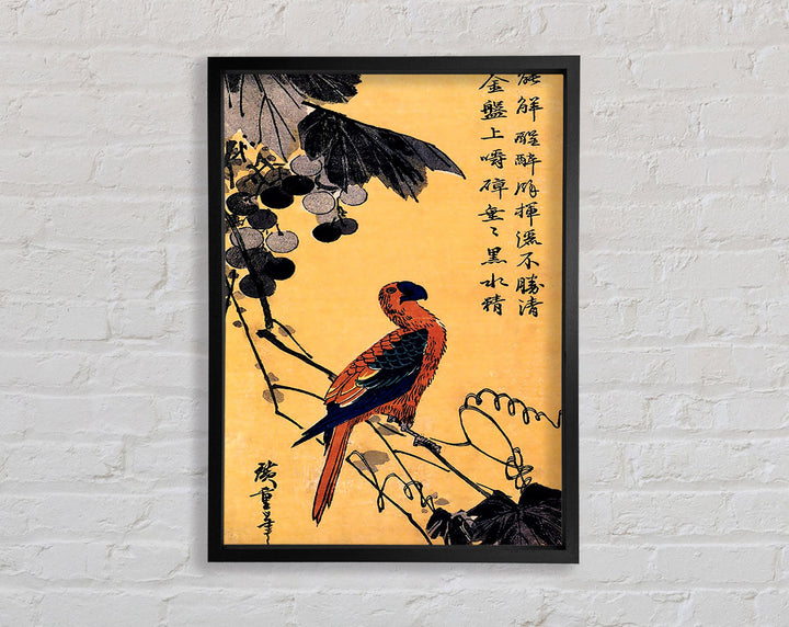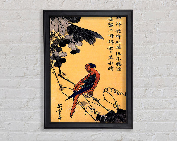 Gerahmter Druck „Hiroshige Ara On A Vine“, erhältlich in mehreren Rahmenfarben. Fertig zum Aufhängen aus der Schachtel und handgefertigt im Vereinigten Königreich.