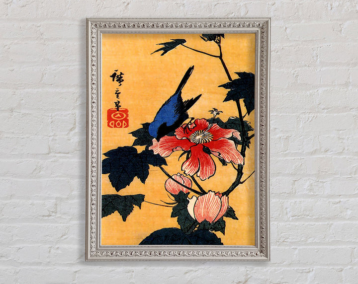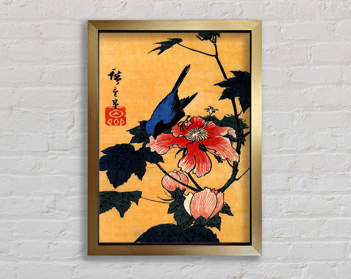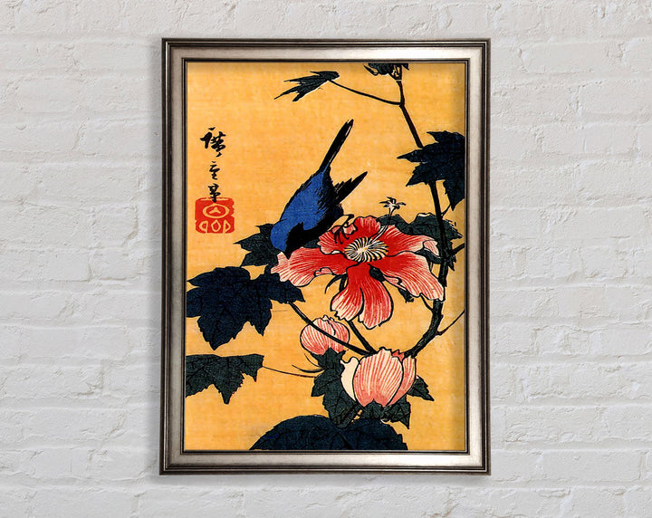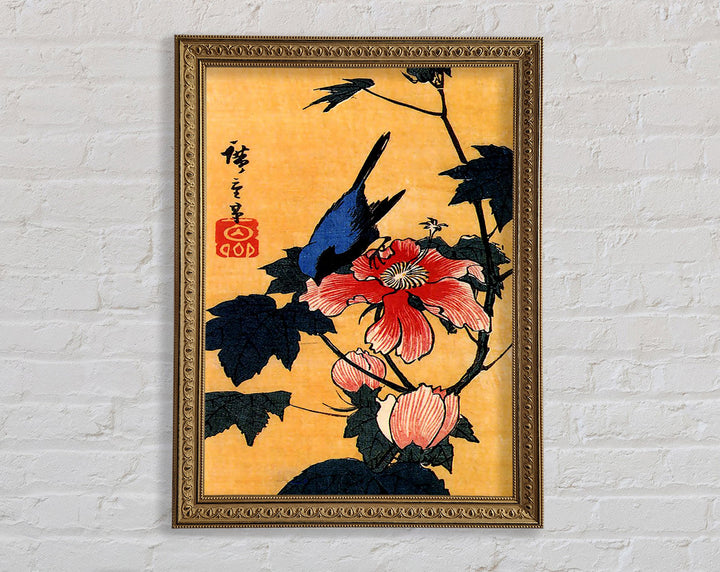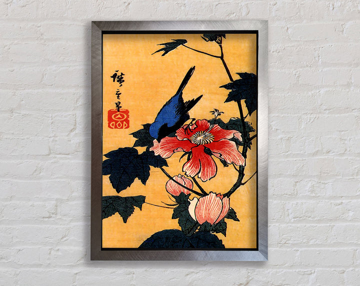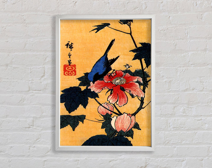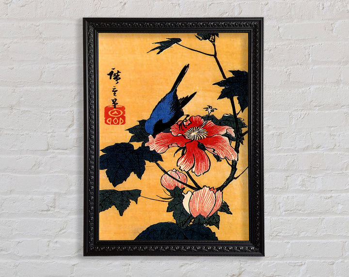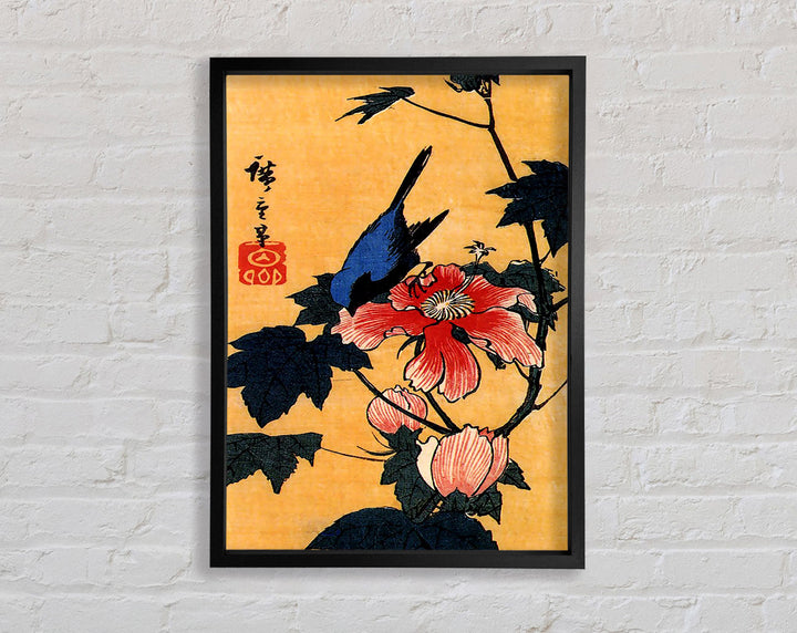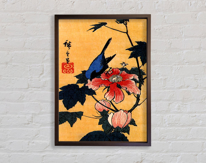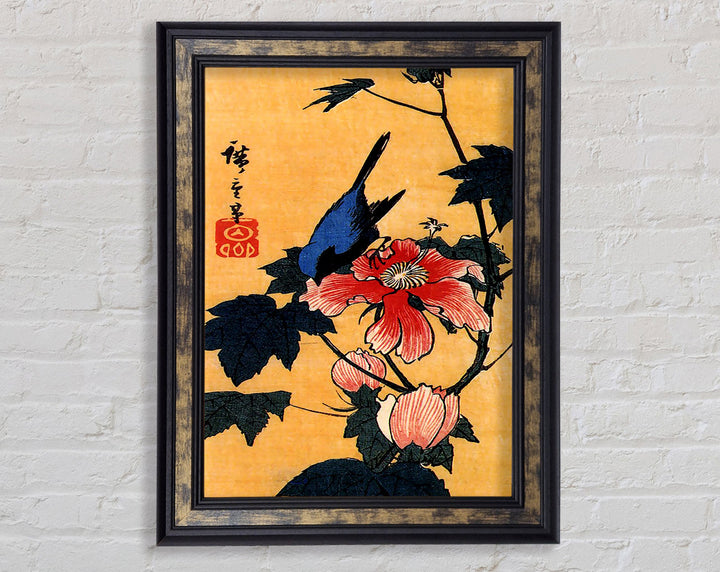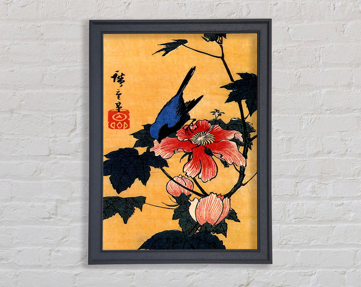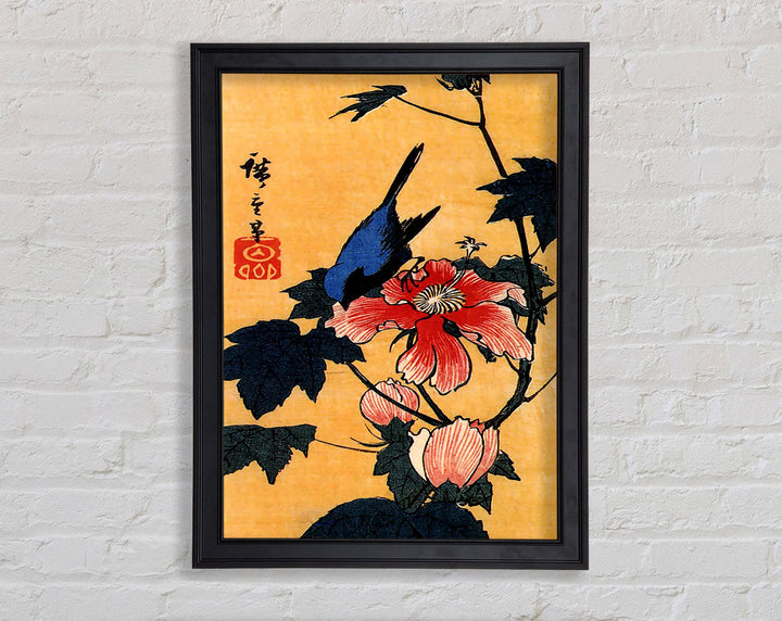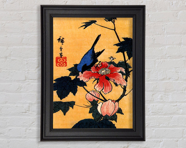 Gerahmter Druck „Vogel auf einer Hibiskusblüte“ von Hiroshige, erhältlich in mehreren Rahmenfarben. Fertig zum Aufhängen aus der Schachtel und handgefertigt im Vereinigten Königreich.
