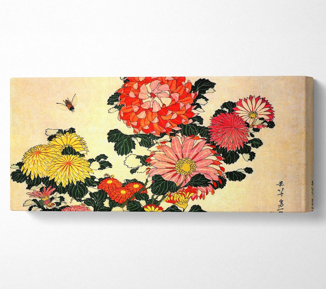 Hokusai-Leinwand „Chrysantheme und Biene“, gedruckt auf beschichteter Polyester-Leinwand. Auf einem 44 mm großen Kastenrahmen montiert, fertig zum Aufhängen.