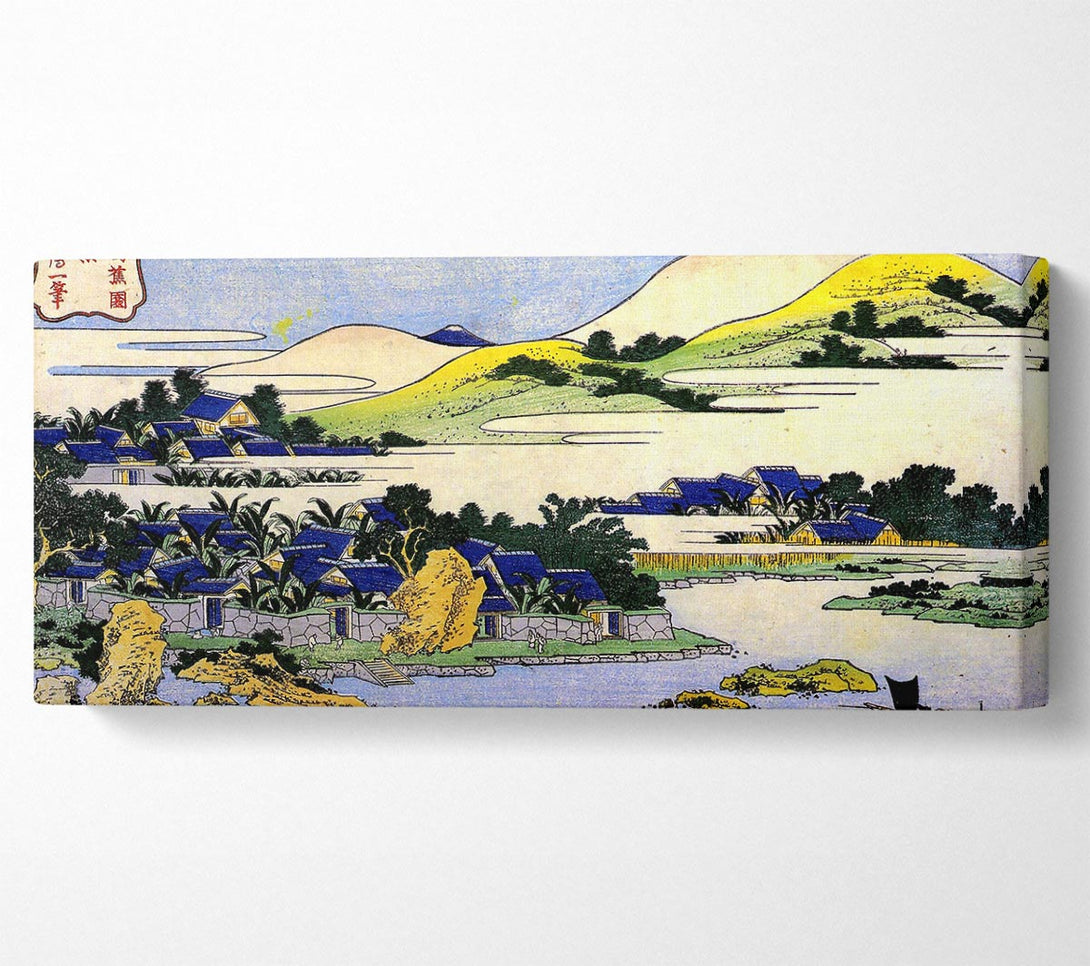 Hokusai-Landschaft von Ryukyu, auf Leinwand gedruckt, auf beschichteter Polyester-Leinwand. Auf einem 44 mm großen Kastenrahmen montiert, fertig zum Aufhängen.
