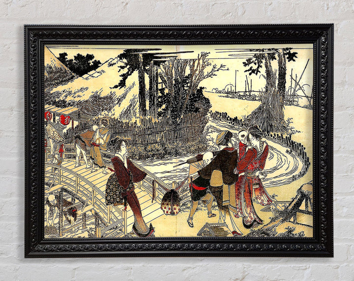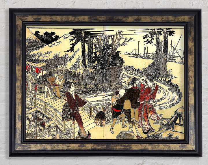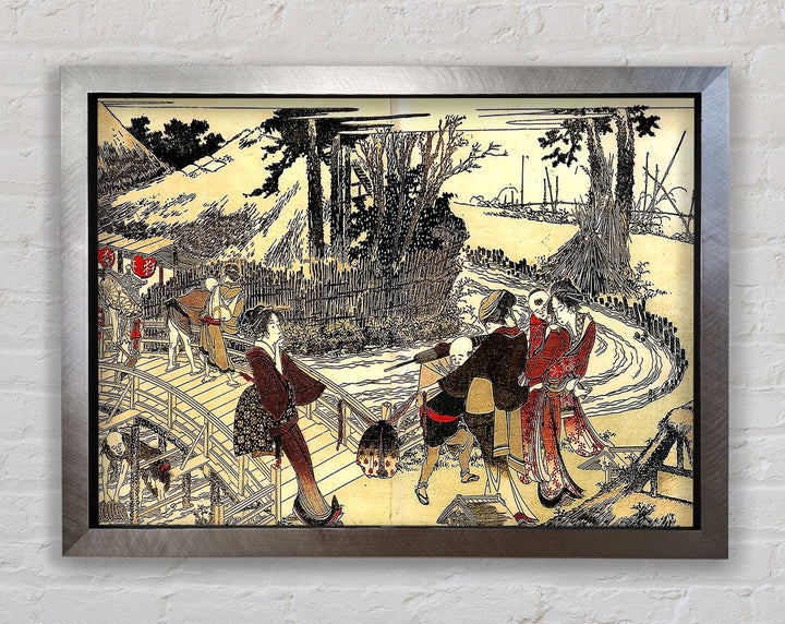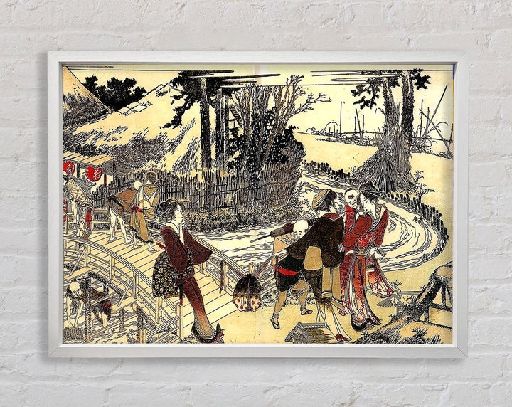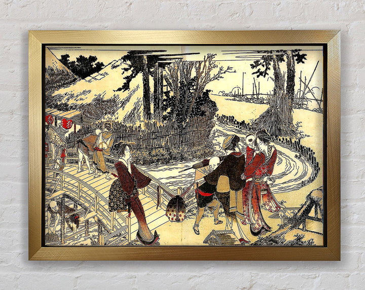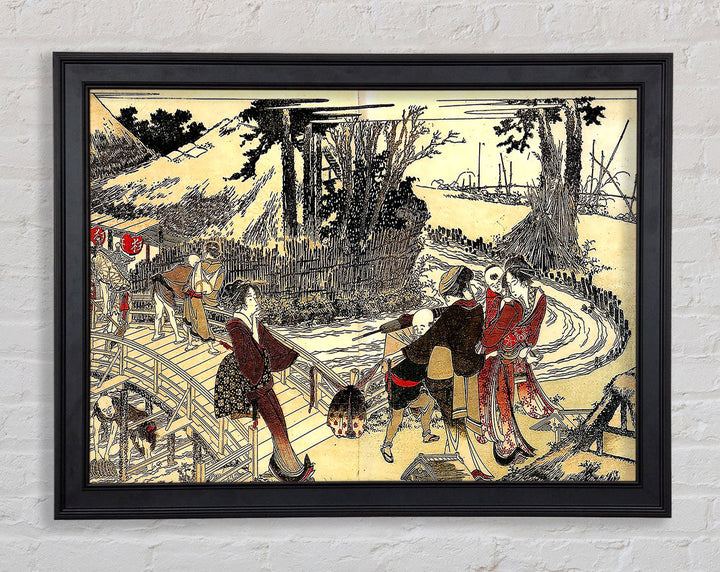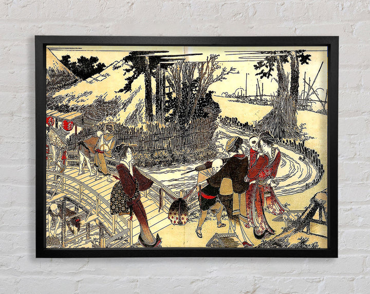 Gerahmter Druck „Hokusai Village Near A Bridge“, erhältlich in mehreren Rahmenfarben. Fertig zum Aufhängen aus der Schachtel und handgefertigt im Vereinigten Königreich.