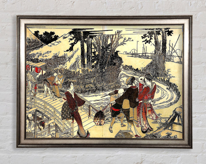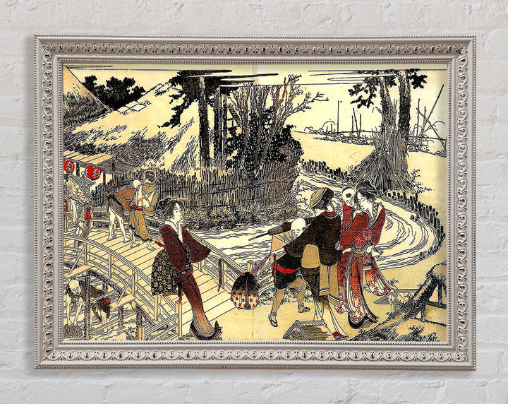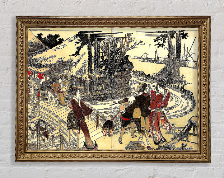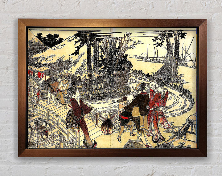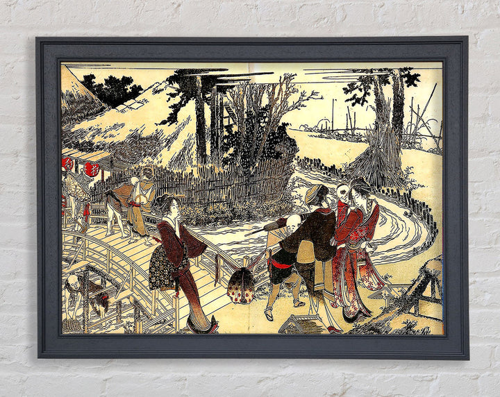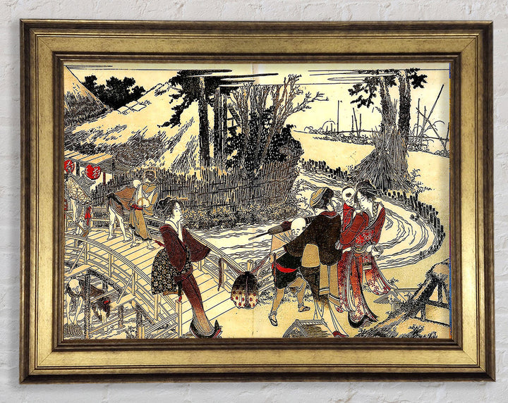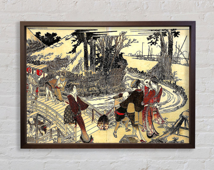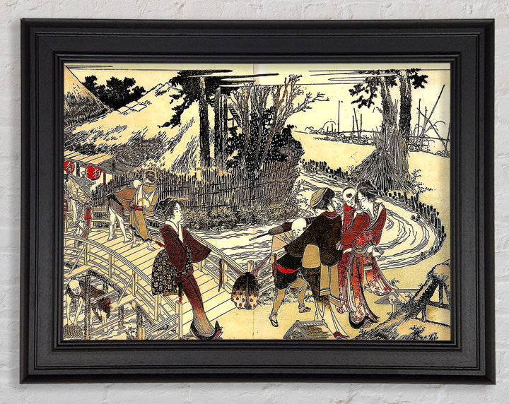 Gerahmter Druck „Hokusai Village Near A Bridge“, erhältlich in mehreren Rahmenfarben. Fertig zum Aufhängen aus der Schachtel und handgefertigt im Vereinigten Königreich.