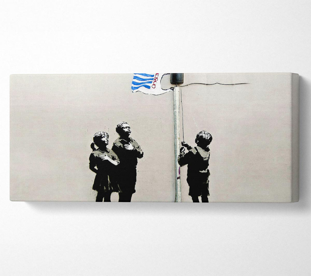 Hommage an die Tesco-Flagge im Querformat, gedruckt auf beschichteter Polyester-Leinwand. Auf einem 44 mm großen Kastenrahmen montiert, fertig zum Aufhängen.