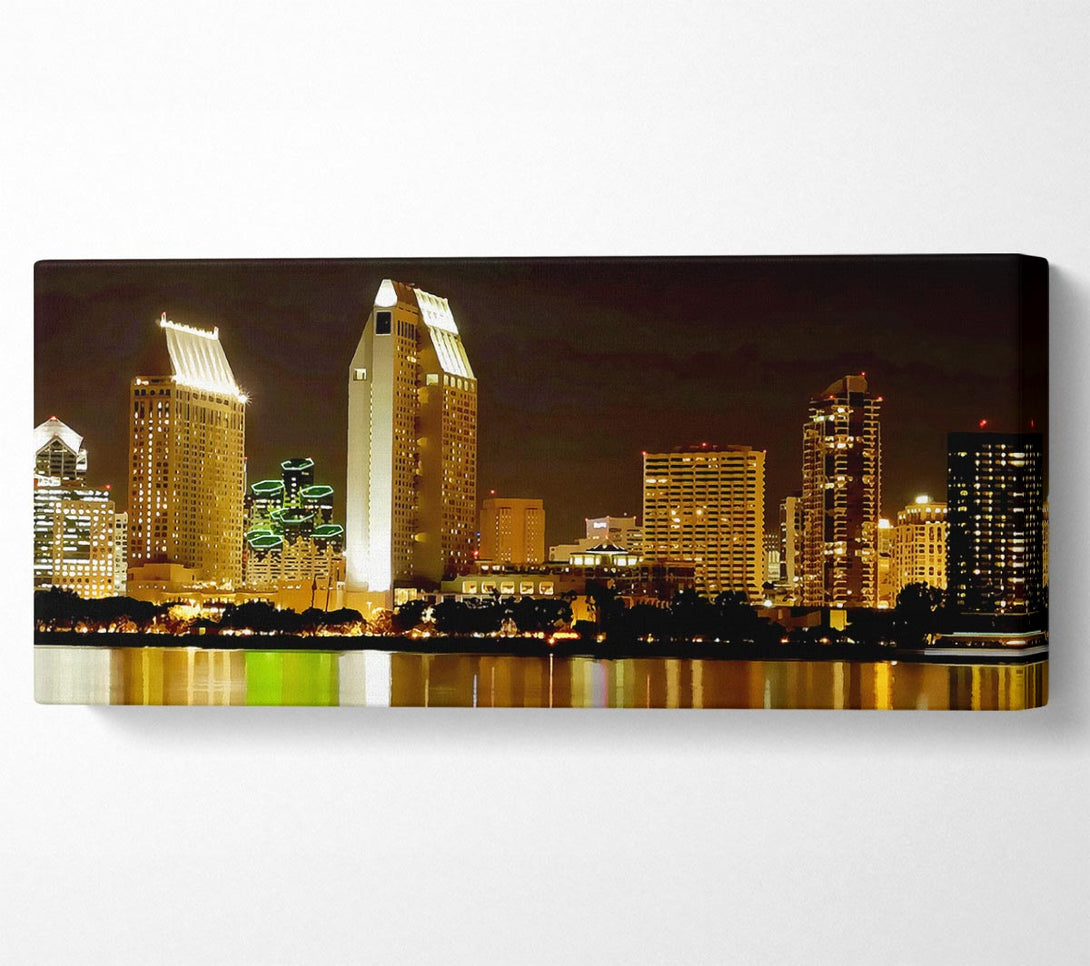 Leinwandbild „Hong Kong Golden Lights“, gedruckt auf beschichteter Polyester-Leinwand. Auf einem 44 mm großen Kastenrahmen montiert, fertig zum Aufhängen.