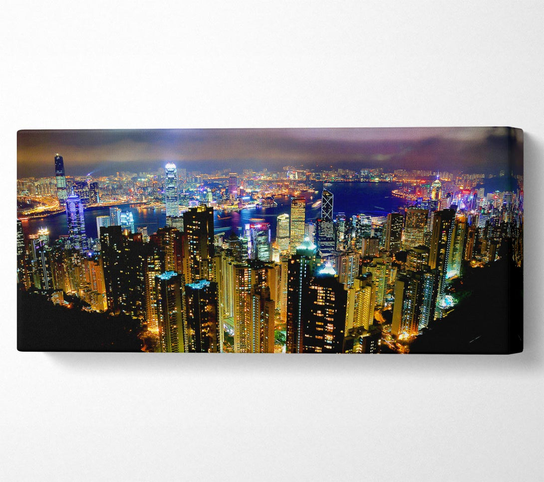 Leinwandbild „Hong Kong Night Light“, gedruckt auf beschichtetem Polyester-Canvas. Auf einem 44 mm großen Kastenrahmen montiert, fertig zum Aufhängen.