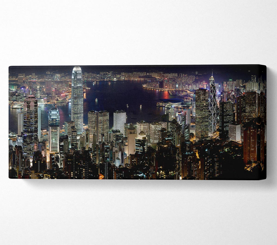 Leinwandbild „Hong Kong Waters At Night“, gedruckt auf beschichteter Polyester-Leinwand. Auf einem 44 mm großen Kastenrahmen montiert, fertig zum Aufhängen.