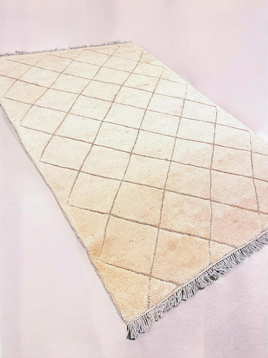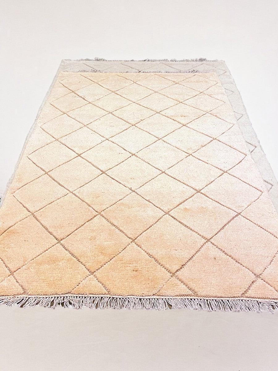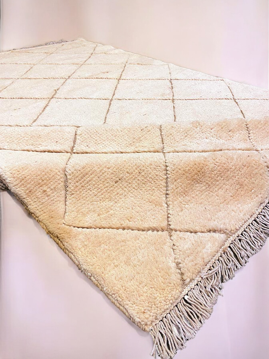 This hand-knotted plush Moroccan rug is a true work of art. Made by skilled craftsmen, it features a cream colour with a mesh-like geometric design. The cream-coloured pile and its' plush texture with geometric flat weave, create layers in the rug that give a sense of warmth and comfort underfoot, making it a great choice for a bedroom or living room.