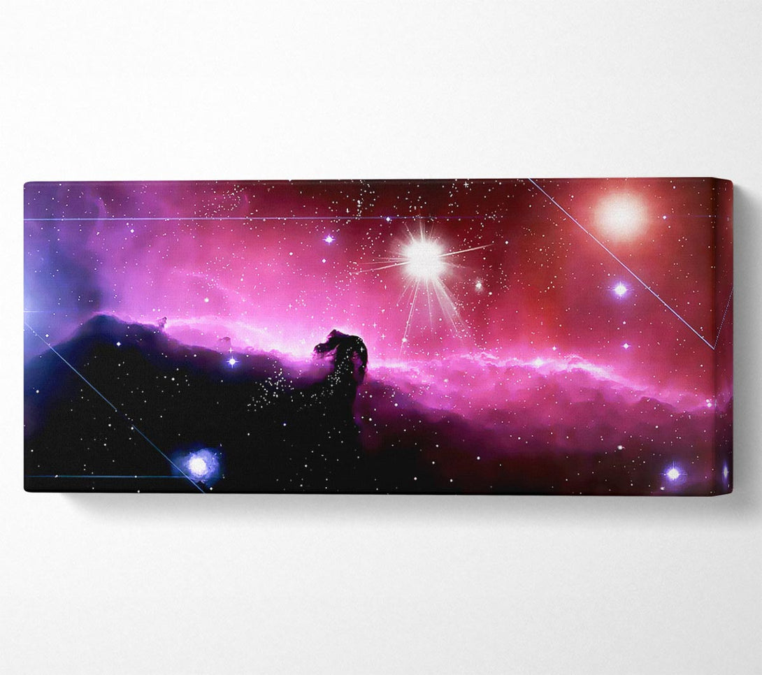 Leinwandbild „Pferdekopfnebel mit Sternschnuppen“, gedruckt auf beschichteter Polyester-Leinwand. Auf einem 44 mm großen Kastenrahmen montiert, fertig zum Aufhängen.