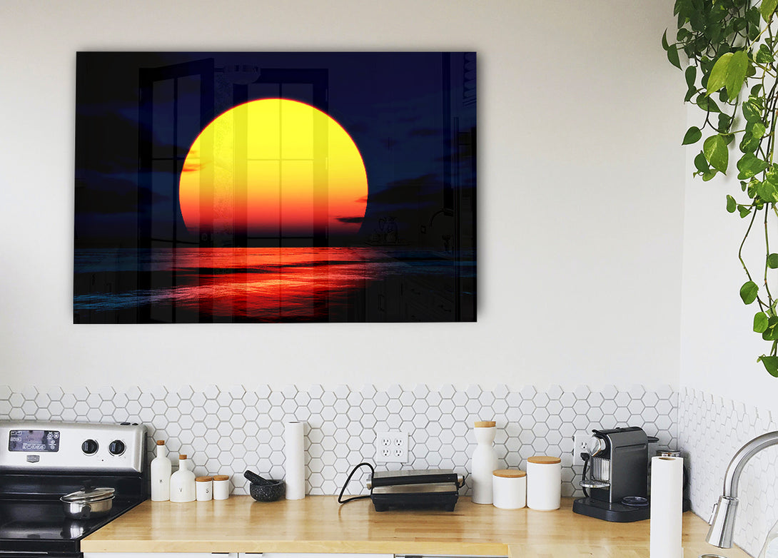 Riesiger Acryldruck „Goldene Sonne über dem Ozean“, UV-gedruckt auf 5 mm dickes Acrylglas. Wird mit allem geliefert, was Sie zum Aufhängen an die Wand brauchen.
