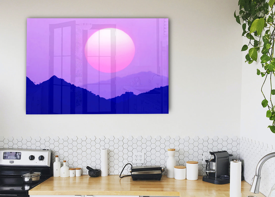 Riesiger lila Acryldruck „Sonne über den Berggipfeln“, UV-gedruckt auf 5 mm dickes Acrylglas. Wird mit allem geliefert, was Sie zum Aufhängen an Ihre Wand brauchen.