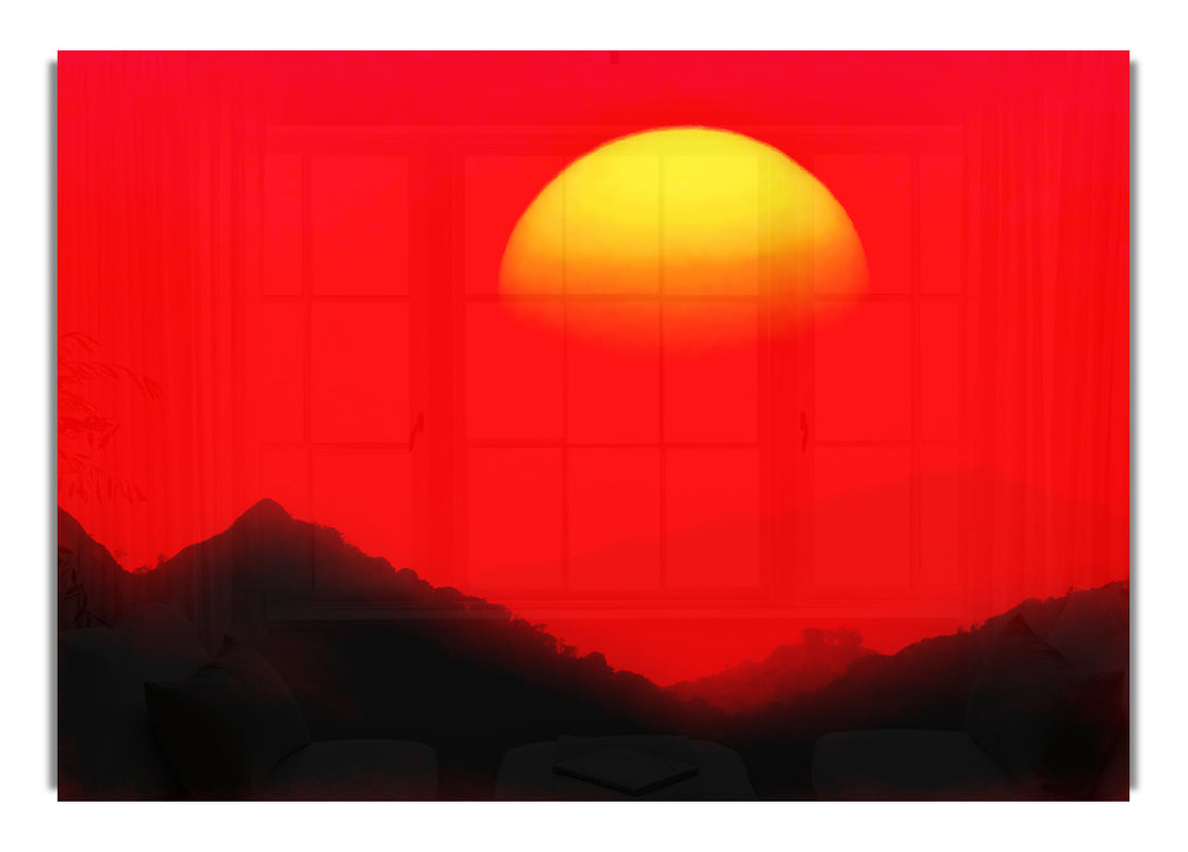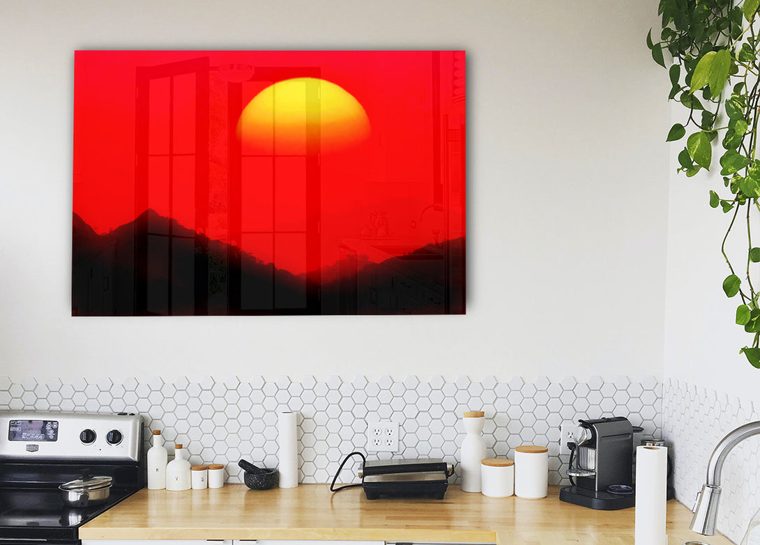Riesiger roter Acryldruck „Sonne über den Berggipfeln“, UV-gedruckt auf 5 mm dickes Acrylglas. Wird mit allem geliefert, was Sie zum Aufhängen an Ihre Wand benötigen.