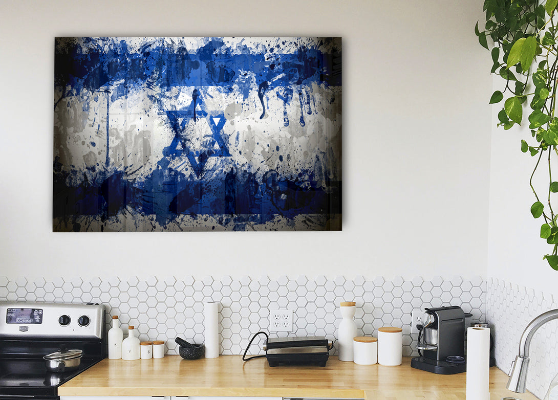 Acryldruck mit Israel-Flagge, UV-gedruckt auf 5 mm dickes Acrylglas. Wird mit allem geliefert, was Sie zum Aufhängen an die Wand brauchen.