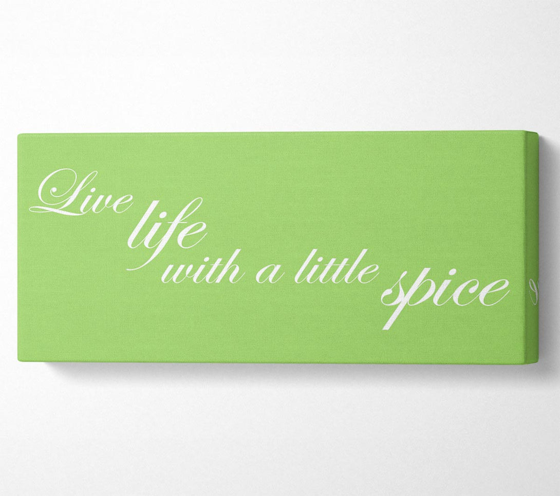 itchen-Zitat „Live Life With A Little Spice“ auf limettengrüner Leinwand, gedruckt auf beschichteter Polyester-Leinwand. Auf einem 44 mm großen Kastenrahmen montiert, fertig zum Aufhängen.