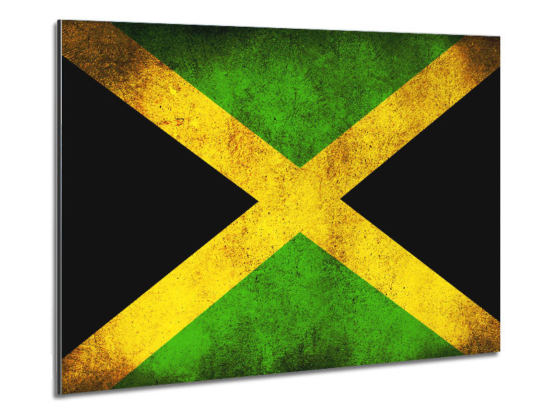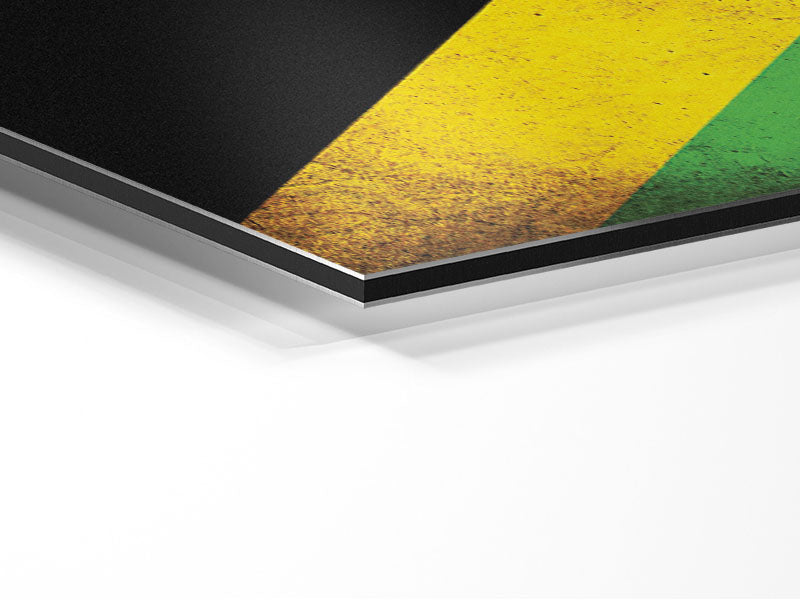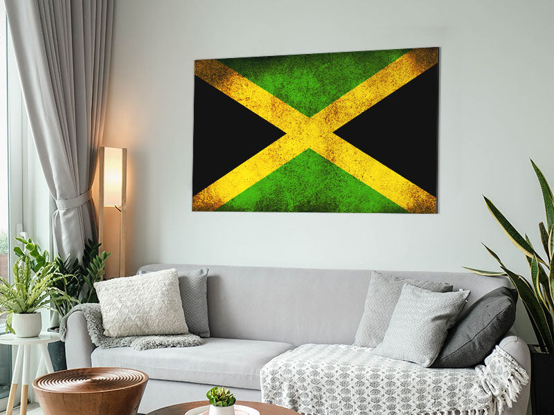 Jamaikanische Grunge-Flagge, gedruckt auf gebürstetem Aluminium-Dibond. Eine moderne Art, Kunst zu präsentieren und leicht zu pflegen.