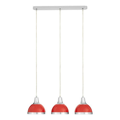 The light is mounted on to the ceiling with a sleek rectangular metal beam that complements the chrome hood and trim on each of the three pendants. The smooth metal pendants have a rounded design and a bright red finish.