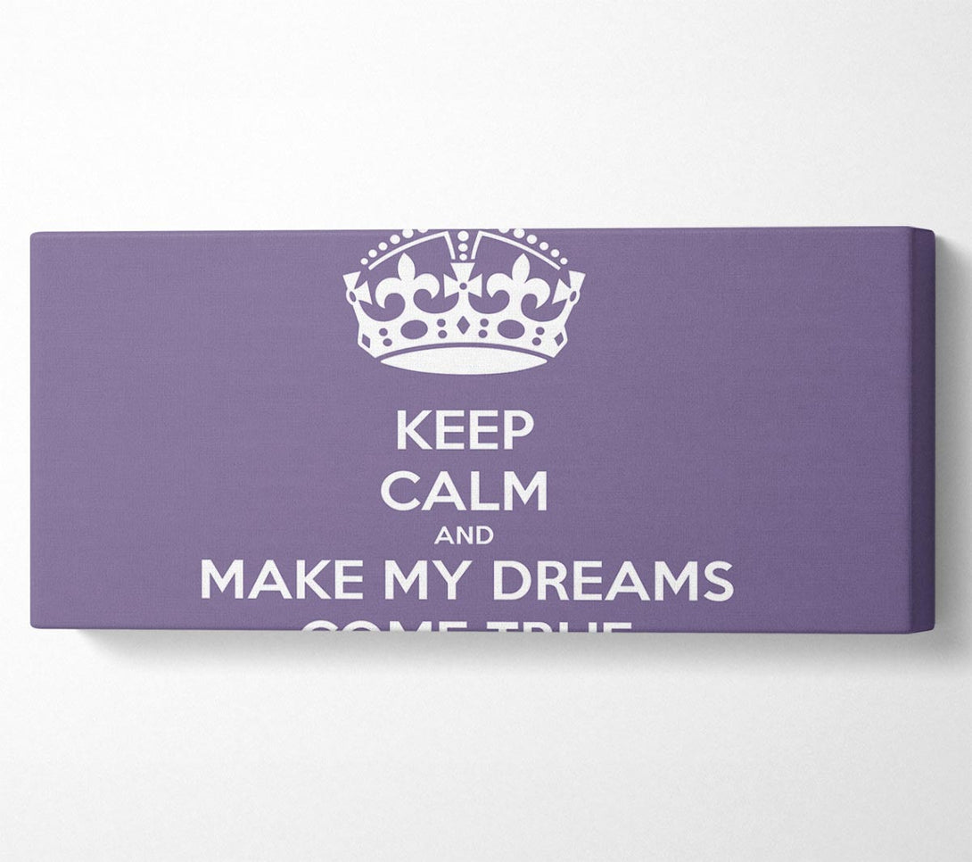 „Keep Calm Make Your Dreams Come True“ – Lila Leinwand, gedruckt auf beschichteter Polyester-Leinwand. Auf einem 44 mm großen Kastenrahmen montiert, fertig zum Aufhängen.